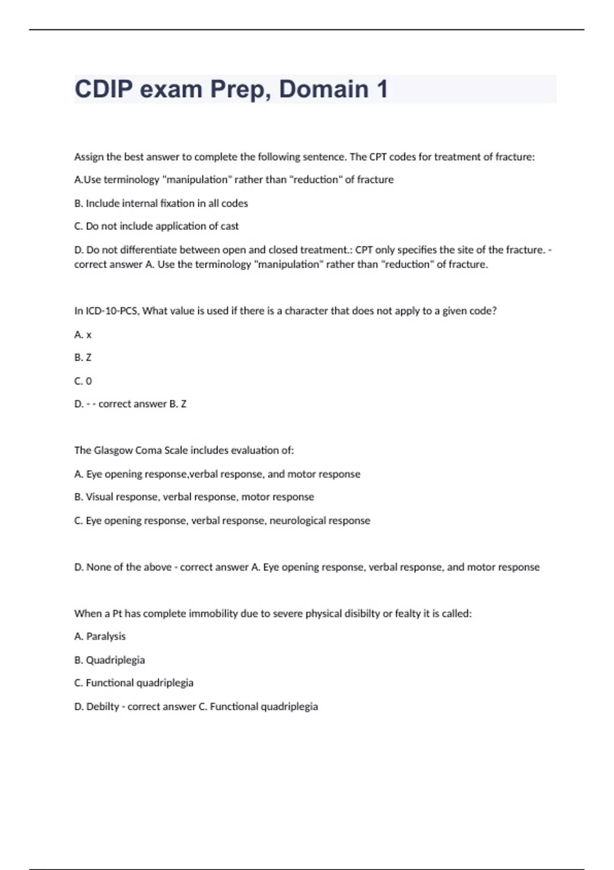 CDIP exam Prep, Domain 1Assign the best answer to complete the following sentence. The CPT codes for treatment of fracture: A.Use terminology "manipulation" rather than "reduction" of fracture B. Include internal fixation in all codes C. Do not include application of cast D. Do not differentiate between open and closed treatment.: CPT only specifies the site of the fracture. - correct answer A. Use the terminology "manipulation" rather than "reduction" of fracture. In ICD-10-PCS, What value is used if there is a character that does not apply to a given code? A. x B. Z C. 0 D. - - correct answer B. Z The Glasgow Coma Scale includes evaluation of: A. Eye opening response,verbal response, and motor response B. Visual response, verbal response, motor response C. Eye opening response, verbal response, neurological response D. None of the above - correct answer A. Eye opening response, verbal response, and motor response When a Pt has complete immobility due to severe physical disibilty or fealty it is called: A. Paralysis B. Quadriplegia C. Functional quadriplegia D. Debilty - correct answer C. Functional quadriplegia This root operation alters the diameter or route of a tubular body part and completely closes an orifice or lumen; for Ex tubal ligation of fallopian tube. A. dilation B. Ligation C. Occlusion D. Restriction - correct answer C. Occlusion Potential stakeholders of the CDI program include the ______. A. CDI team B. Providers. C. Medical executive committee. D. All of the above. - correct answer D. All of the above. Which graphical representation shows differences in frequencies or percentages among categories? Histograph Line graph Pie graph Bar graph - correct answer Pie Graph Which of the following is considered discrete data? A.Compliant query components B.reasons for missed queries C.ICD 10 CM codes D.organizations mission - correct answer C. ICD 10 CM codes. Which of the following is unstructured data? A.ICD 10 CM code B.ICD 10 PCS code C.CPT code D.Progress note - correct answer D. Progress note.