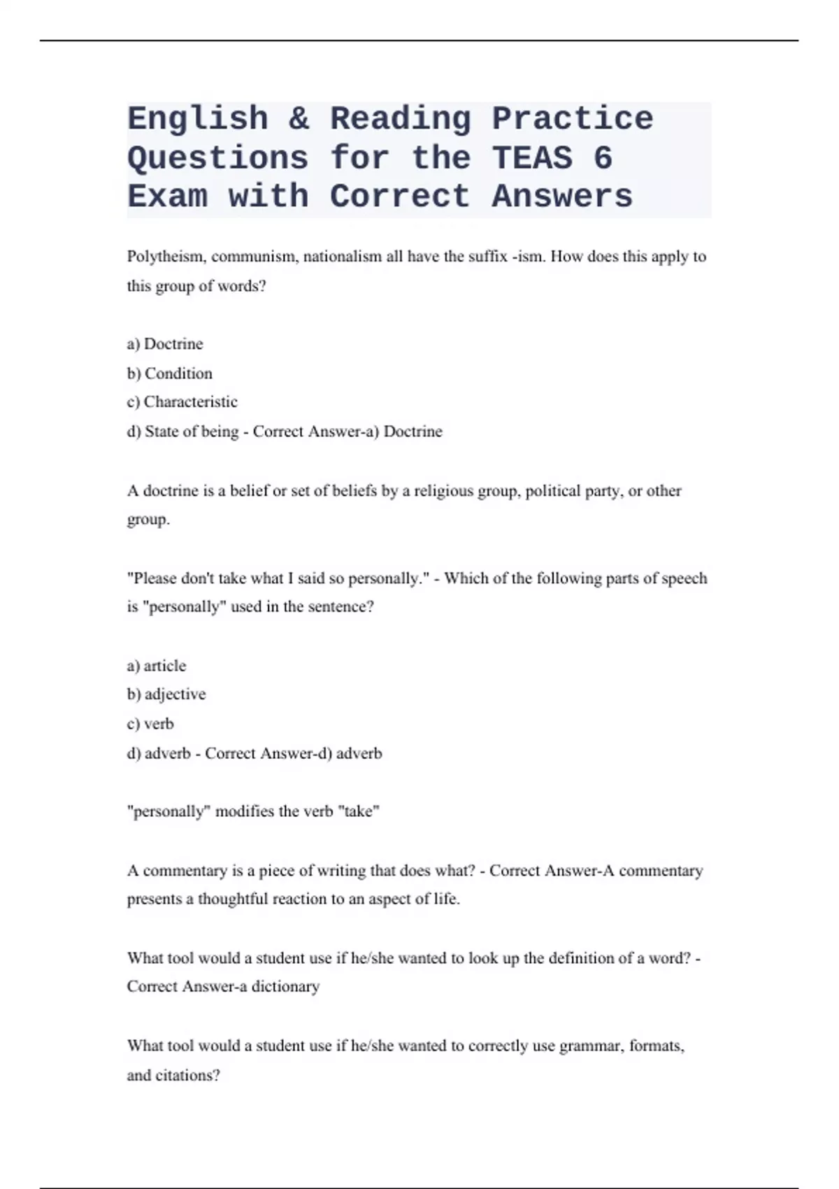 English & Reading Practice Questions for the TEAS 6 Exam with Correct Answers