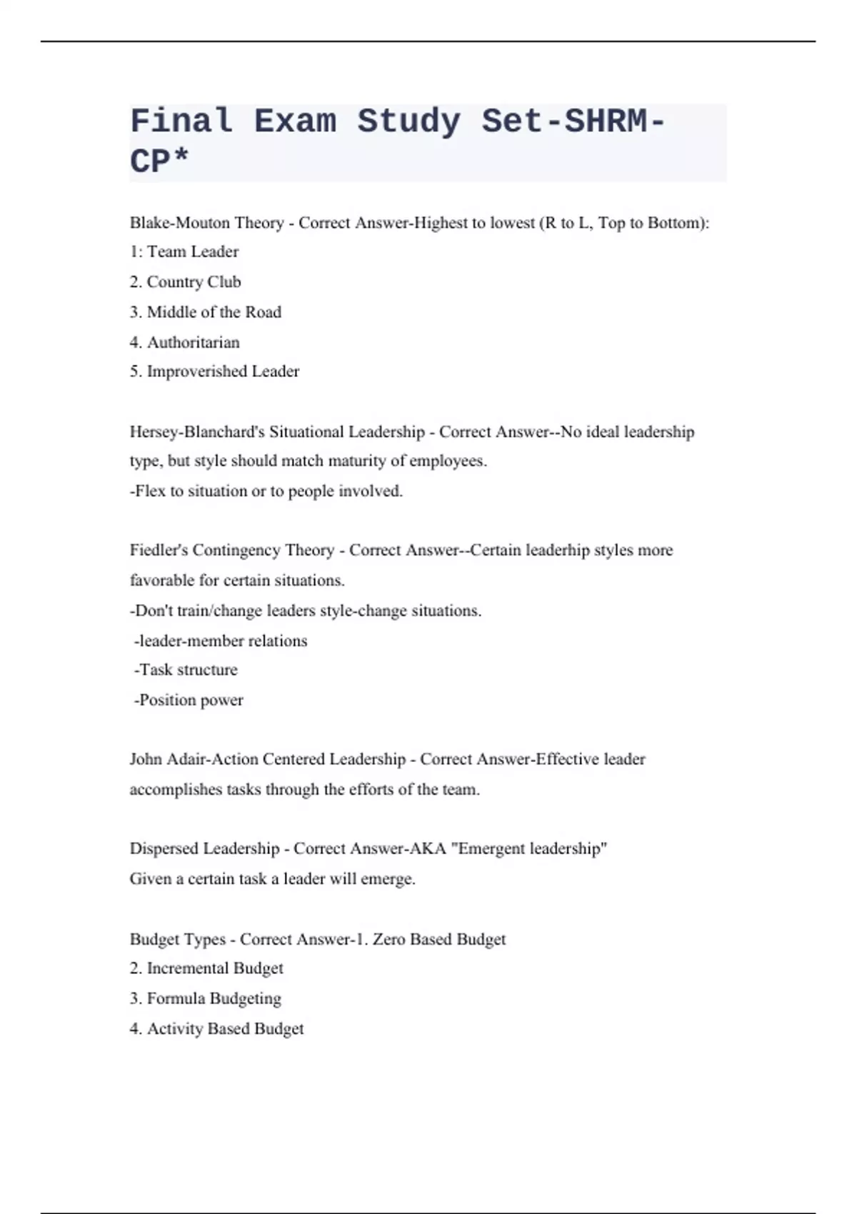 Blake-Mouton Theory - Correct Answer-Highest to lowest (R to L, Top to Bottom): 1: Team Leader 2. Country Club 3. Middle of the Road 4. Authoritarian 5. Improverished Leader Hersey-Blanchard's Situational Leadership - Correct Answer--No ideal leadership type, but style should match maturity of employees. -Flex to situation or to people involved. Fiedler's Contingency Theory - Correct Answer--Certain leaderhip styles more favorable for certain situations. -Don't train/change leaders style-change situations. -leader-member relations -Task structure -Position power John Adair-Action Centered Leadership - Correct Answer-Effective leader accomplishes tasks through the efforts of the team. Dispersed Leadership - Correct Answer-AKA "Emergent leadership" Given a certain task a leader will emerge. Budget Types - Correct Answer-1. Zero Based Budget 2. Incremental Budget 3. Formula Budgeting 4. Activity Based Budget Zero Based Budgeting - Correct Answer--Justify entire budget and show how funding meets Org's goals. -Budget starts at 0 and all expenditures justified each new period. -Goals/units ranked by priority, then $ given. Incremental Budgeting - Correct Answer-Line Item Budgeting. Prior year budget basis for the next. Increased incrementally by a set %. Additional funds must be requested based on need. Formula Based Budgetting - Correct Answer--Different units or operations receive varying %'s. -General funding is changed by specific amount units, budgets adjusted accordingly. Activity Based Budgetting - Correct Answer--Not how much to divide $, but how much it costs to perform enterprise activities. -Funding may be allocated in strategic significance. Balanced Scorecard - Correct Answer-Measurement approach that provides an overall picture of an organization's performance in the following ways: Metrics from 4 organizational perspectives 1) Financial 2) Customer 3) Internal Business processes 4) Learning + Growth HR Strategic Process - Correct Answer-1) Get the big picture 2) Conduct HR SWOT analysis 3) Develop HR Mission & Vision Statements 4) Conduct detailed HR analysis 5) Determine critical people issues. 6) Develop HR goals, metrics, consequences, & solutions. 7) Develop an implementation & evaluation plan.