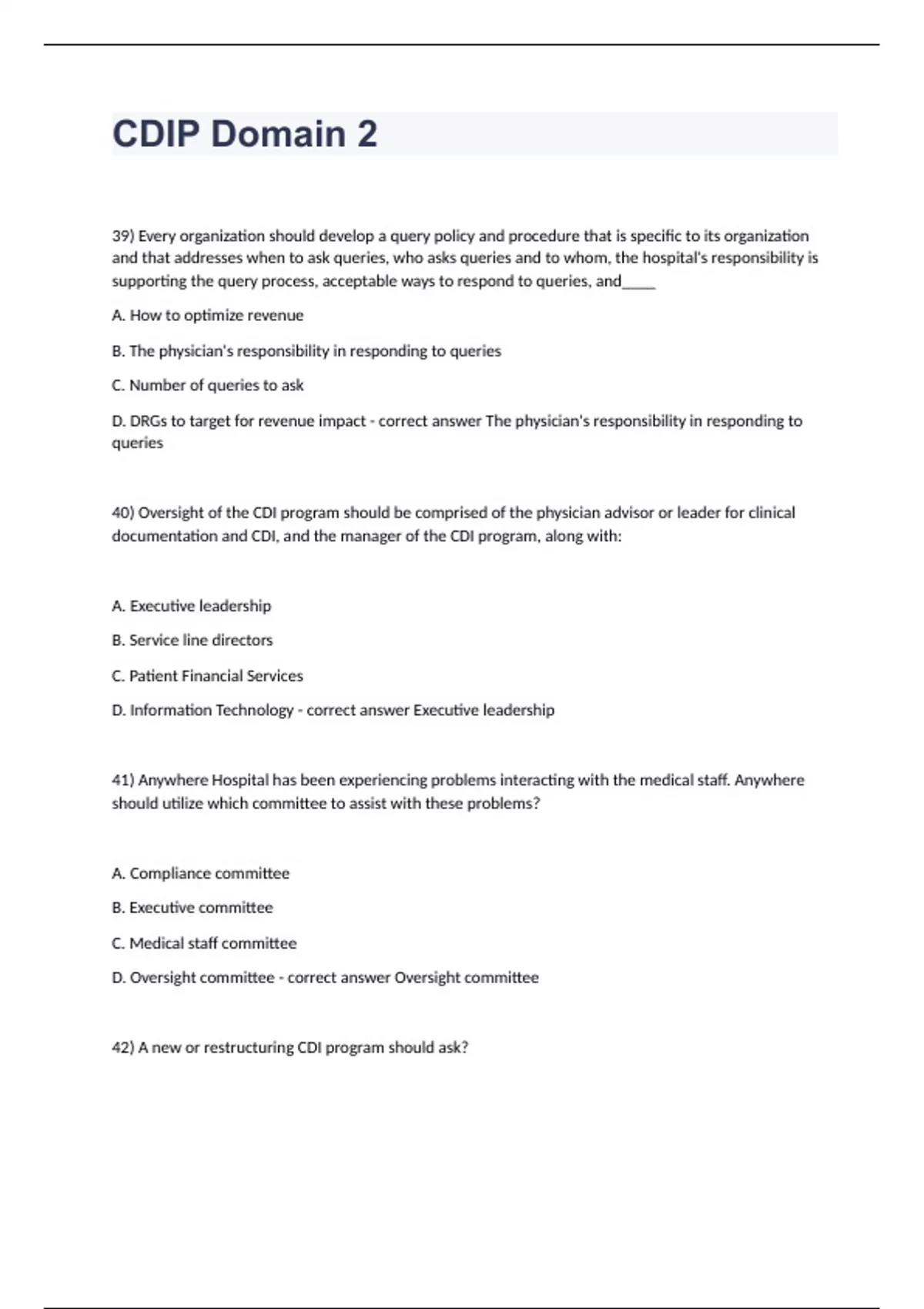 CDIP Domain 2 39) Every organization should develop a query policy and procedure that is specific to its organization and that addresses when to ask queries, who asks queries and to whom, the hospital's responsibility is supporting the query process, acceptable ways to respond to queries, and____ A. How to optimize revenue B. The physician's responsibility in responding to queries C. Number of queries to ask D. DRGs to target for revenue impact - correct answer The physician's responsibility in responding to queries 40) Oversight of the CDI program should be comprised of the physician advisor or leader for clinical documentation and CDI, and the manager of the CDI program, along with: A. Executive leadership B. Service line directors C. Patient Financial Services D. Information Technology - correct answer Executive leadership 41) Anywhere Hospital has been experiencing problems interacting with the medical staff. Anywhere should utilize which committee to assist with these problems? A. Compliance committee B. Executive committee C. Medical staff committee D. Oversight committee - correct answer Oversight committee 42) A new or restructuring CDI program should ask? A. How can the bottom line be increased? B. How many queries must be performed for financial success? C. Why does clinical documentation need to be improved? D. How fast can this be done? - correct answer Why does clinical documentation need to be improved? 43) A new CDI program is experiencing conflicts within the health record between a consulting physician and the physician ultimately responsible for the documentation of the patient. The physician ultimately responsible is the: A. Consulting physician B. Hospitalist C. Attending physician D. Intensivist - correct answer Attending physician 44) Which of the following would generally be found in a query to a physician? A. Health record number and demographic information B. Name and contact number of the individual initiating the query and the encounter number. C. Date query initiated and date query must be complete D. Demographic information and name and contact number of individual initiating the query. - correct answer Name and contact number of the individual initiating the query and the encounter number. 45) In conducting a qualitative review, the clinical documentation specialist sees that the nursing staff has documented the patient's skin integrity on admission to support the presence of a stage I pressure ulcer. However, the physician's documentation is unclear as to whether this condition was present on admission. How should the clinical documentation specialist proceed? A. Note the condition as present on admission. B. Query the physician to determine if the condition was present on admission C. Note the condition as unknown on admission