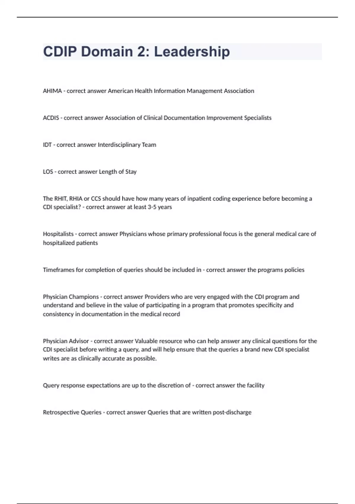 CDIP Domain 2 LeadershipAHIMA - correct answer American Health Information Management Association ACDIS - correct answer Association of Clinical Documentation Improvement Specialists IDT - correct answer Interdisciplinary Team LOS - correct answer Length of Stay The RHIT, RHIA or CCS should have how many years of inpatient coding experience before becoming a CDI specialist? - correct answer at least 3-5 years Hospitalists - correct answer Physicians whose primary professional focus is the general medical care of hospitalized patients Timeframes for completion of queries should be included in - correct answer the programs policies Physician Champions - correct answer Providers who are very engaged with the CDI program and understand and believe in the value of participating in a program that promotes specificity and consistency in documentation in the medical record Physician Advisor - correct answer Valuable resource who can help answer any clinical questions for the CDI specialist before writing a query, and will help ensure that the queries a brand new CDI specialist writes are as clinically accurate as possible. Query response expectations are up to the discretion of - correct answer the facility Retrospective Queries - correct answer Queries that are written post-discharge CDI Toolkit - correct answer provides information for establishing a CDI program Policies and procedures should be in what type of format for easy reference? - correct answer Written MS-DRG - correct answer Medicare Severity-Diagnosis Related Groups SOI - correct answer Severity of Illness ROM - correct answer Risk of Mortality A multi-disciplinary team approach should include - correct answer physicians and their mid-levels (ARNPs and PAs), clinical documentation specialists, coders, administration, and appropriate hospital staff RHIT - correct answer Registered Health Information Technician RHIA - correct answer Registered Health Information Administrator CCS - correct answer Certified Coding Specialist RN - correct answer Registered Nurse Clinical documentation specialists can be - correct answer RHITs, RHIAs, CCS, or RNs CDI - correct answer Clinical Documentation Improvement