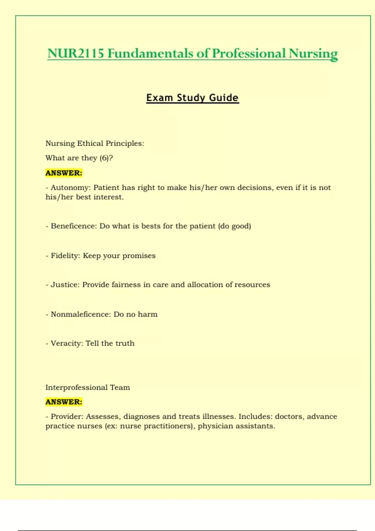 Exam Study Guide - NUR2115 / NUR 2115 (Latest 2023 / 2024) : Fundamentals Of Professional Nursing - Rasmussen