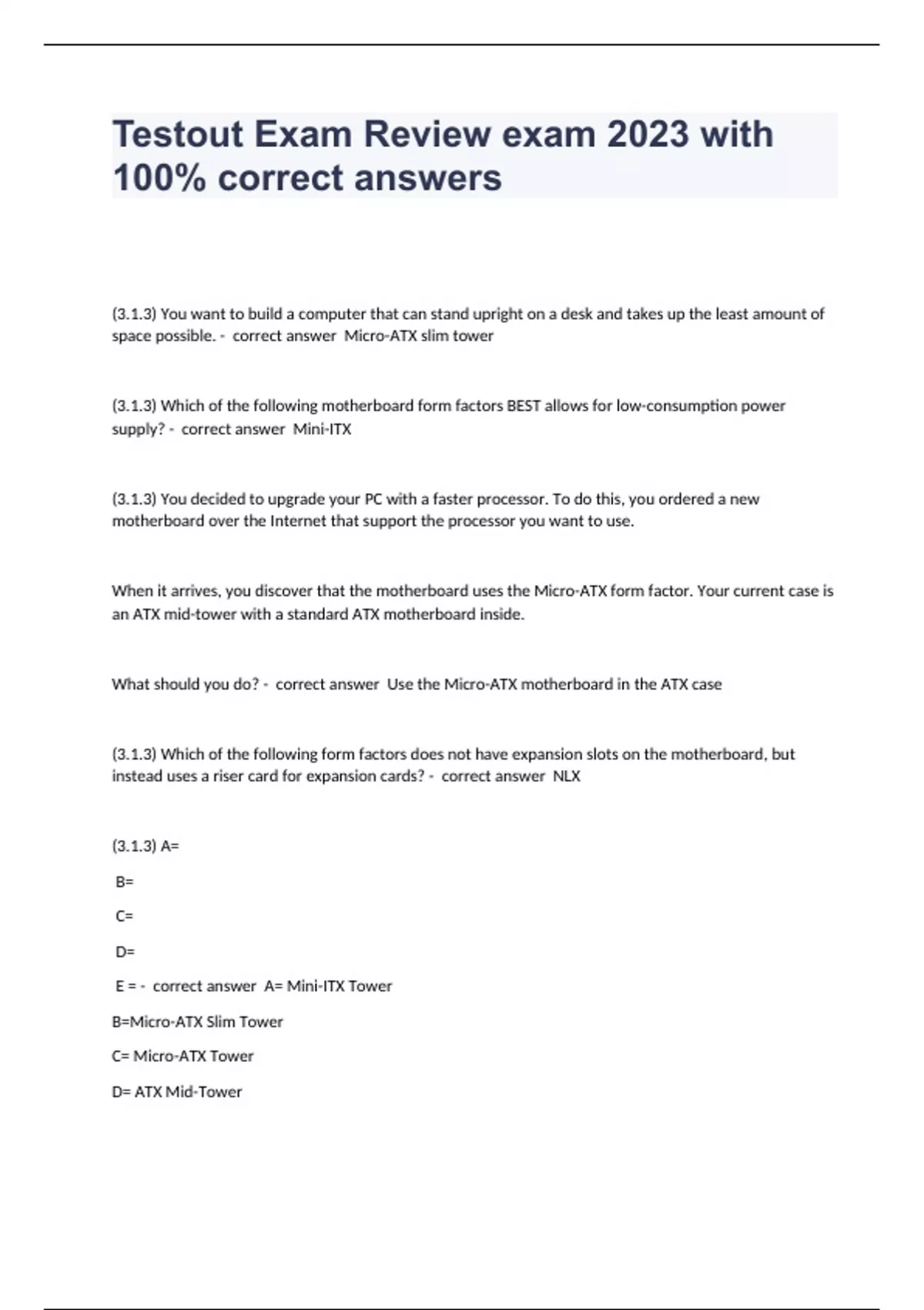 (3.1.3) You want to build a computer that can stand upright on a desk and takes up the least amount of space possible. - correct answer Micro-ATX slim tower (3.1.3) Which of the following motherboard form factors BEST allows for low-consumption power supply? - correct answer Mini-ITX (3.1.3) You decided to upgrade your PC with a faster processor. To do this, you ordered a new motherboard over the Internet that support the processor you want to use. When it arrives, you discover that the motherboard uses the Micro-ATX form factor. Your current case is an ATX mid-tower with a standard ATX motherboard inside. What should you do? - correct answer Use the Micro-ATX motherboard in the ATX case (3.1.3) Which of the following form factors does not have expansion slots on the motherboard, but instead uses a riser card for expansion cards? - correct answer NLX (3.1.3) A= B= C= D= E = - correct answer A= Mini-ITX Tower B=Micro-ATX Slim Tower C= Micro-ATX Tower D= ATX Mid-Tower E= ATX Full-Tower (3.1.3) You need to purchase a case that meets the following criteria: Compatible with most form factors At least two external and internal bays Good balance of size and space - correct answer ATX mid-tower (3.1.3) You work as the IT administrator for a small corporate network. One of the company employees needs to add an additional PCI card to the motherboard. When you open the computer, you see that the card pur