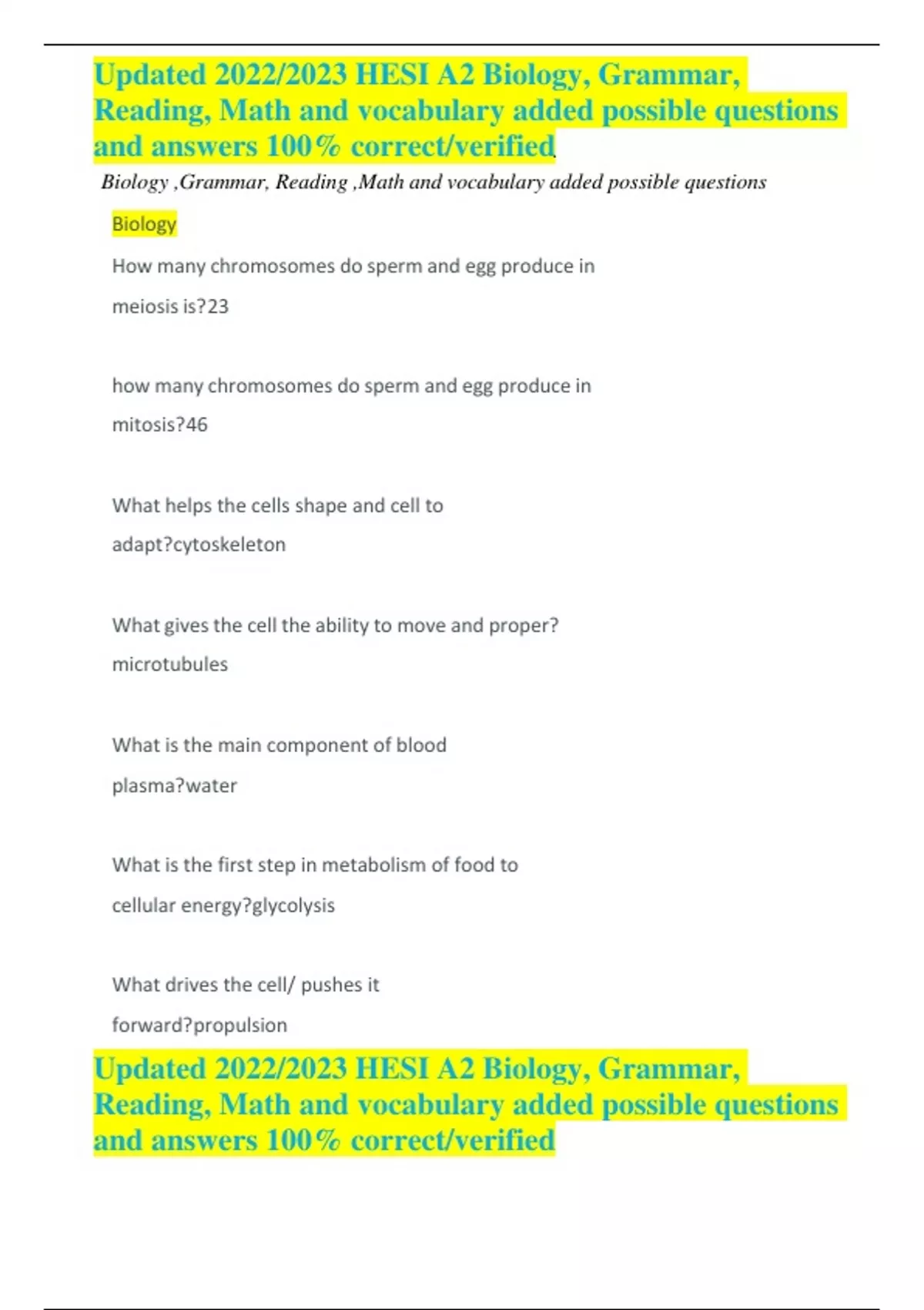 Updated 2022/2023 HESI A2 Biology, Grammar,