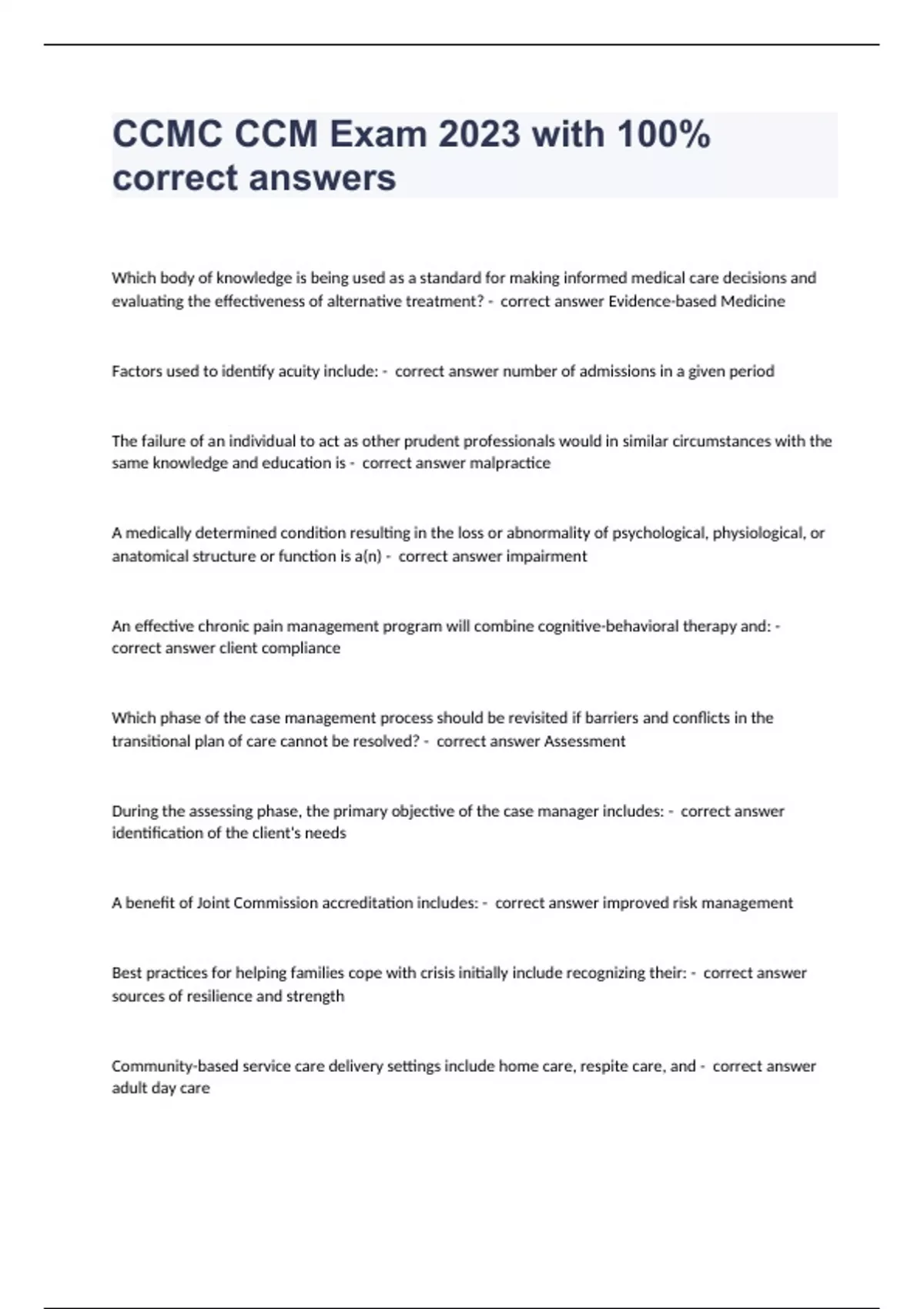 Which body of knowledge is being used as a standard for making informed medical care decisions and evaluating the effectiveness of alternative treatment? - correct answer Evidence-based Medicine Factors used to identify acuity include: - correct answer number of admissions in a given period The failure of an individual to act as other prudent professionals would in similar circumstances with the same knowledge and education is - correct answer malpractice A medically determined condition resulting in the loss or abnormality of psychological, physiological, or anatomical structure or function is a(n) - correct answer impairment An effective chronic pain management program will combine cognitive-behavioral therapy and: - correct answer client compliance Which phase of the case management process should be revisited if barriers and conflicts in the transitional plan of care cannot be resolved? - correct answer Assessment During the assessing phase, the primary objective of the case manager includes: - correct answer identification of the client's needs A benefit of Joint Commission accreditation includes: - correct answer improved risk management Best practices for helping families cope with crisis initially include recognizing their: - correct answer sources of resilience and strength Community-based service care delivery settings include home care, respite care, and - correct answer adult day care