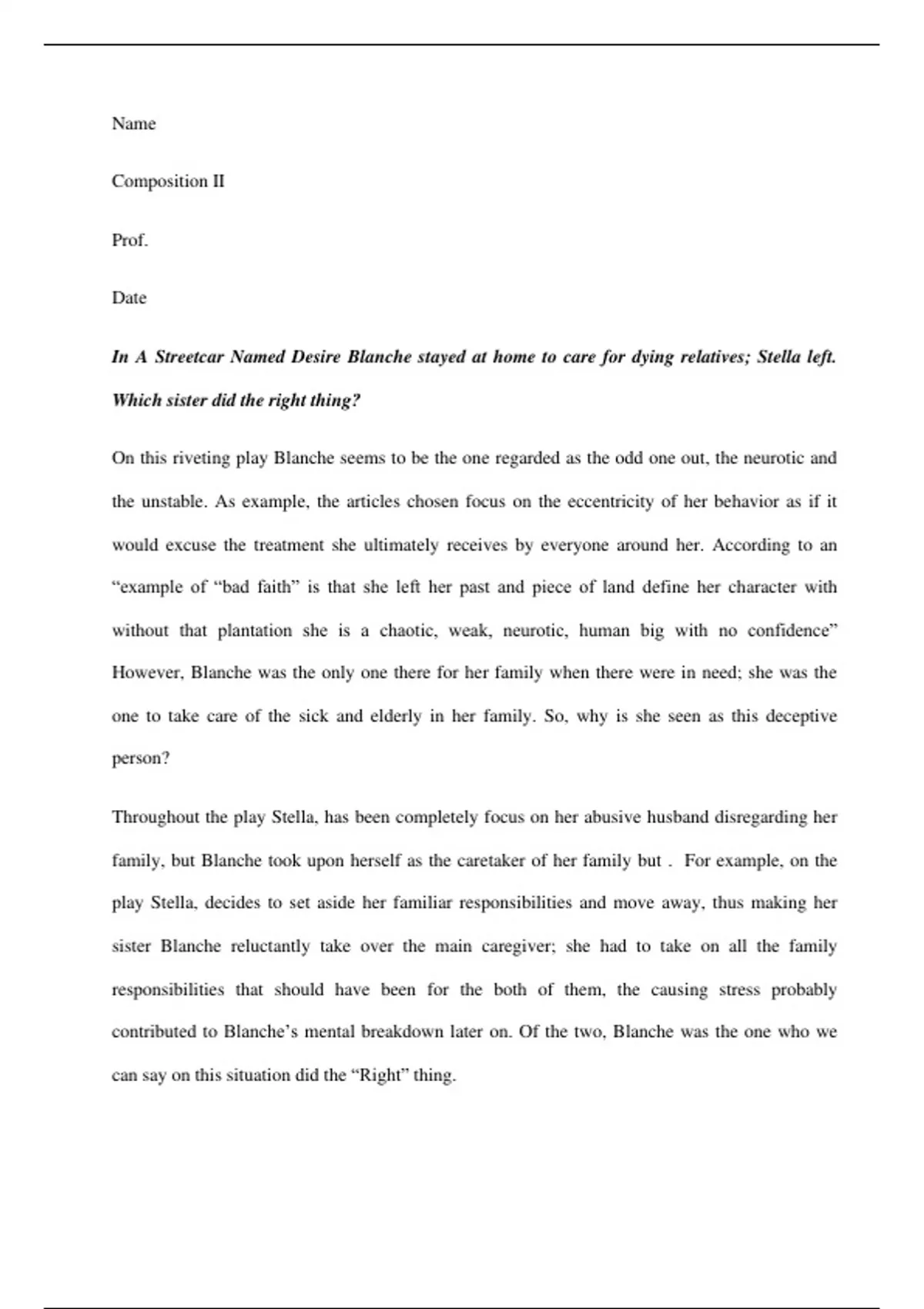 Argumentative Essay - Streetcar named desire - In A Streetcar Named Desire Blanche stayed at home to care for dying relatives; Stella left. Which sister did the right thing?