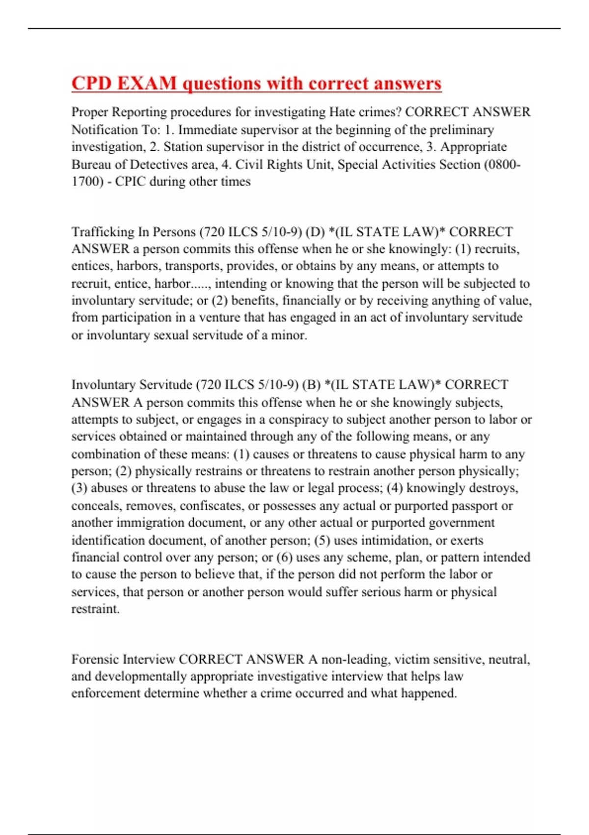 Proper Reporting procedures for investigating Hate crimes? CORRECT ANSWER Notification To: 1. Immediate supervisor at the beginning of the preliminary investigation, 2. Station supervisor in the district of occurrence, 3. Appropriate Bureau of Detectives area, 4. Civil Rights Unit, Special Activities Section () - CPIC during other times Trafficking In Persons (720 ILCS 5/10‐9) (D) *(IL STATE LAW)* CORRECT ANSWER a person commits this offense when he or she knowingly: (1) recruits, entices, harbors, transports, provides, or obtains by any means, or attempts to recruit, entice, harbor....., intending or knowing that the person will be subjected to involuntary servitude; or (2) benefits, financially or by receiving anything of value, from participation in a venture that has engaged in an act of involuntary servitude or involuntary sexual servitude of a minor. Involuntary Servitude (720 ILCS 5/10‐9) (B) *(IL STATE LAW)* CORRECT ANSWER A person commits this offense when he or she knowingly subjects, attempts to subject, or engages in a conspiracy to subject another person to labor or services obtained or maintained through any of the following means, or any combination of these means: (1) causes or threatens to cause physical harm to any person; (2) physically restrains or threatens to restrain another person physically; (3) abuses or threatens to abuse the law or legal process; (4) knowingly destroys, conceals, removes, confiscates, or possesses any actual or purported passport or another immigration document, or any other actual or purported government identification document, of another person; (5) uses intimidation, or exerts financial control over any person; or (6) uses any scheme, plan, or pattern intended to cause the person to believe that, if the person did not perform the labor or services, that person or another person would suffer serious harm or physical restraint. Forensic Interview CORRECT ANSWER A non‐leading, victim sensitive, neutral, and developmentally appropriate investigative interview that helps law enforcement determine whether a crime occu