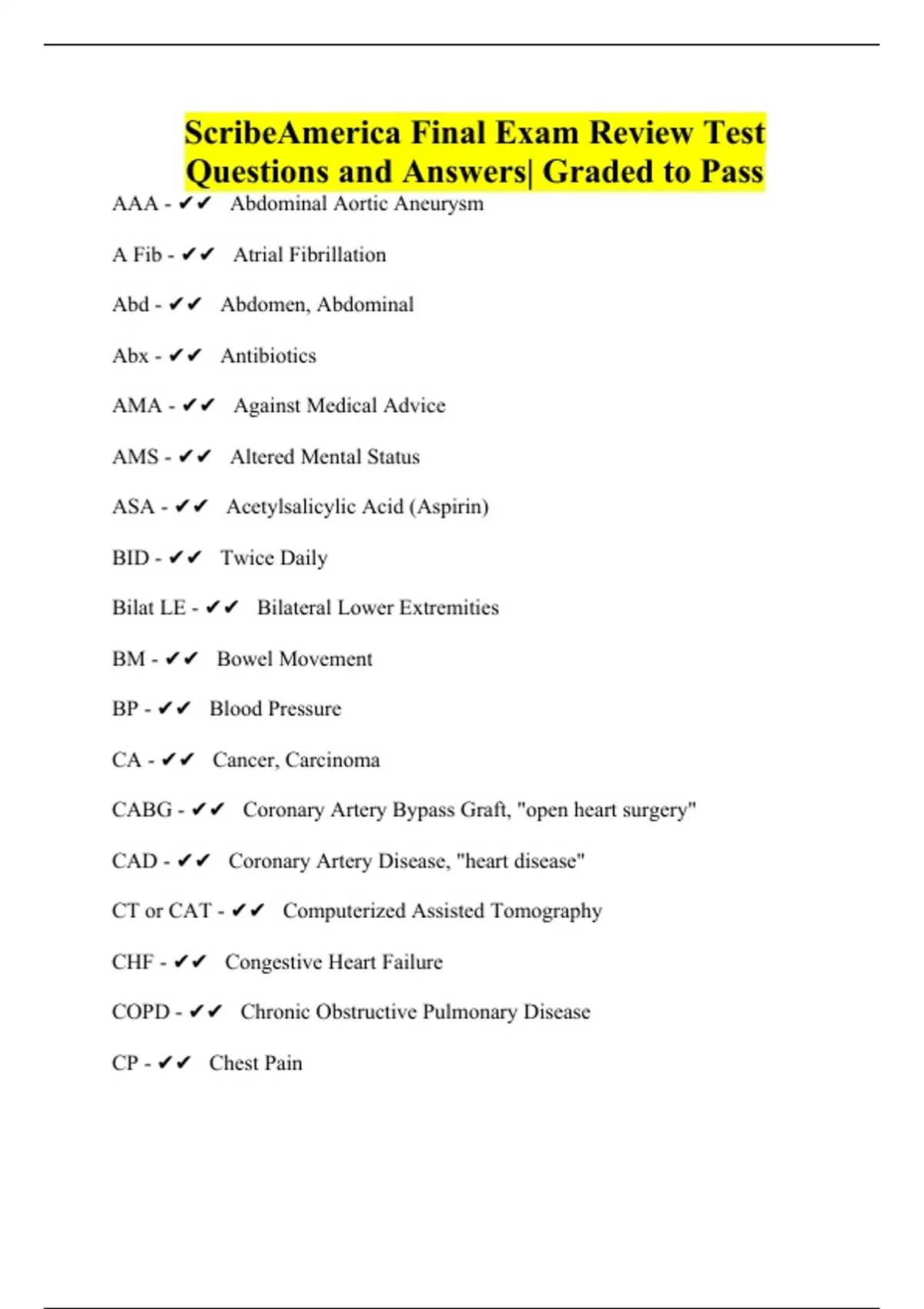 AAA - Abdominal Aortic Aneurysm A Fib - Atrial Fibrillation Abd - Abdomen, Abdominal Abx - Antibiotics AMA - Against Medical Advice AMS - Altered Mental Status ASA - Acetylsalicylic Acid (Aspirin) BID - Twice Daily Bilat LE - Bilateral Lower Extremities BM - Bowel Movement BP - Blood Pressure CA - Cancer, Carcinoma CABG - Coronary Artery Bypass Graft, "open heart surgery" CAD - Coronary Artery Disease, "heart disease" CT or CAT - Computerized Assisted Tomography CHF - Congestive Heart Failure COPD - Chronic Obstructive Pulmonary Disease CP - Chest Pain CPR - Cardiopulmonary Resuscitation C-section - Caesarean Section C-spine - Cervical Spine (neck) CSF - Cerebrospinal Fluid CVA - Cerebrovascular Accident -or- Costovertebral Angle CXR - Chest X-Ray c/o - complains of DKA - Diabetic Ketoacidosis DM - Diabetes Mellitus DNR - Do Not Resuscitate DOE - Dyspnea On Exertion DVT - Deep Venous Thrombosis Dx - Diagnosis Dz - Disease EKG/ECG - Electrocardiogram EtOH - Alcohol FHx - Family History Fx - Fracture GI - Gastrointestinal G/P/Ab - Gravida/Para/Abortion GSW - Gun Shot Wound