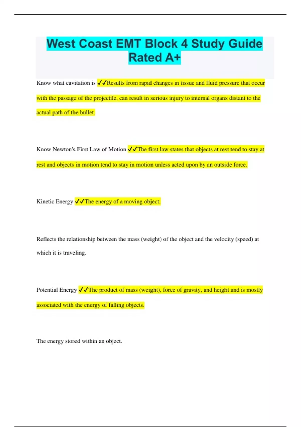 Know what cavitation is Results from rapid changes in tissue and fluid pressure that occur with the passage of the projectile, can result in serious injury to internal organs distant to the actual path of the bullet. Know Newton's First Law of Motion The first law states that objects at rest tend to stay at rest and objects in motion tend to stay in motion unless acted upon by an outside force. Kinetic Energy The energy of a moving object. Reflects the relationship between the mass (weight) of the object and the velocity (speed) at which it is traveling. Potential Energy The product of mass (weight), force of gravity, and height and is mostly associated with the energy of falling objects. The energy stored within an object.