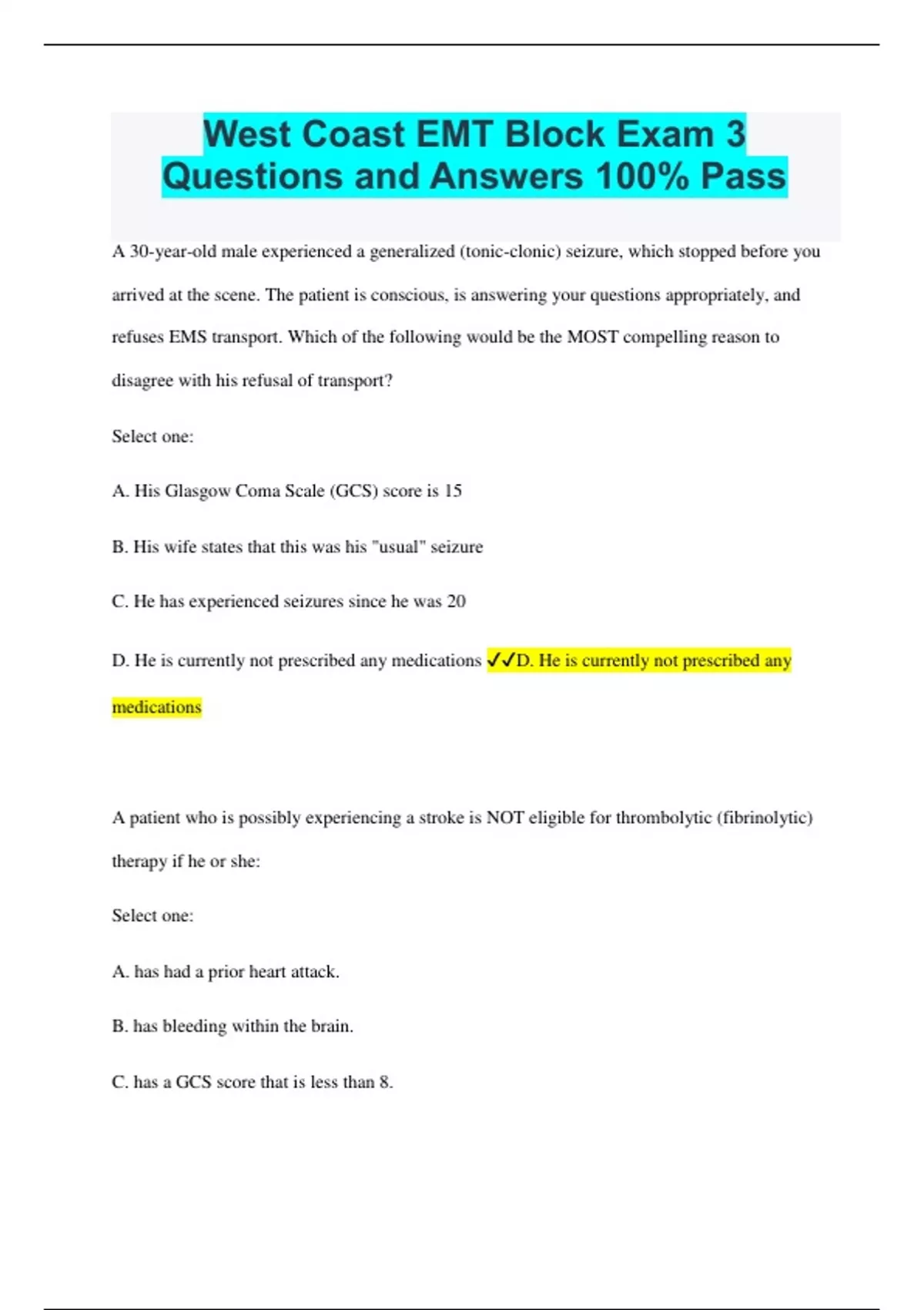 A 30-year-old male experienced a generalized (tonic-clonic) seizure, which stopped before you arrived at the scene. The patient is conscious, is answering your questions appropriately, and refuses EMS transport. Which of the following would be the MOST compelling reason to disagree with his refusal of transport? Select one: A. His Glasgow Coma Scale (GCS) score is 15 B. His wife states that this was his "usual" seizure C. He has experienced seizures since he was 20 D. He is currently not prescribed any medications D. He is currently not prescribed any medications A patient who is possibly experiencing a stroke is NOT eligible for thrombolytic (fibrinolytic) therapy if he or she: Select one: A. has had a prior heart attack. B. has bleeding within the brain. C. has a GCS score that is less than 8. D. is older than 60 years of age. B. has bleeding within the brain. A patient whose speech is slurred and difficult to understand is experiencing: Select one: A. paraplegia. B. dysphagia. C. dysarthria. D. aphasia. C. dysarthria. A patient with an altered mental status is: Select one: A. typically alert but is confused as to preceding events. B. not thinking clearly or is incapable of being aroused. C. usually able to be aroused with a painful stimulus. D. completely unresponsive to all forms of stimuli. B. not thinking clearly or is incapable of being aroused. During the primary assessment of a semiconscious 70-year-old female, you should: