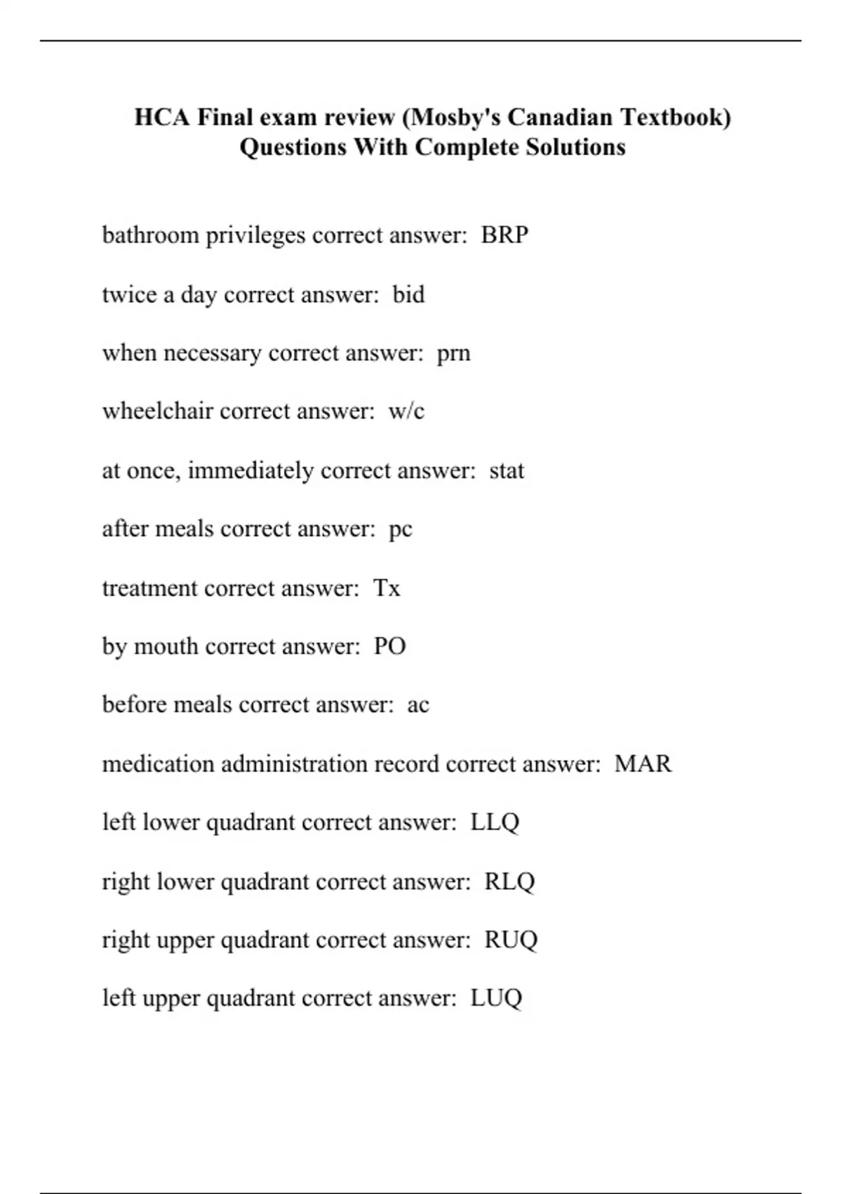 HCA Final exam review (Mosby's Canadian Textbook) Questions With Complete Solutions