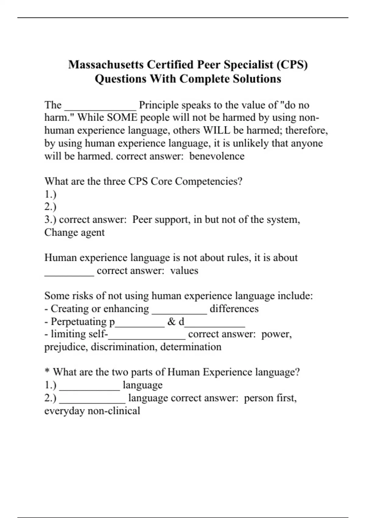 The _____________ Principle speaks to the value of "do no harm." While SOME people will not be harmed by using non-human experience language, others WILL be harmed; therefore, by using human experience language, it is unlikely that anyone will be harmed. correct answer: benevolence What are the three CPS Core Competencies? 1.) 2.) 3.) correct answer: Peer support, in but not of the system, Change agent Human experience language is not about rules, it is about _________ correct answer: values Some risks of not using human experience language include: - Creating or enhancing __________ differences - Perpetuating p_________ & d___________ - limiting self-______________ correct answer: power, prejudice, discrimination, determination * What are the two parts of Human Experience language? 1.) ___________ language 2.) ____________ language correct answer: person first, everyday non-clinical When a CPS utilizes ________________ language, they act as a change agent by setting an uncompromising example that all people are greater than and come before any label or judgement. correct answer: human experience When a CPS utilizes human experience language, they act as a _________ agent by setting an uncompromising example that all people are greater than and come before any l_________or j___________ correct answer: change, label, judgement ____________ is the shared values, behaviors, traditions, customs, symbols, history, and ways of thinking/living of a group of people correct answer: culture We don't see things as ______ are. We see them as _____ are. correct answer: they, we * The three critical elements to exploring cross-cultural partnerships are: 1.) learning about _________ 2.) learning about _________ 3.) learning about ________ correct answer: yourself, cultures, individuals When exploring cross-cultural partnerships, learning about ourselves indicates learning about our b________ and p_________ correct answer: biases, privilege When exploring cross-cultural partnerships, questions to ask when learning about ourselves may include: - What b______ do I carry? - What p______ have I benefited from? - How can these things impact the way that I r________ to certain issues? - How might the parts of my identity that I view to be important i________with the beliefs/cultures of others? correct answer: biases, privilege, respond, intersect When exploring cross-cultural partnerships, questions to ask when learning about cultures may include: - What c_______ or l_______ barriers might arise when interacting with different groups? - What d__________ have people from this culture commonly experienced and what impact might this have had on them? - What else can I do to l_______ about this culture? correct answer: communication, language, discrimination, learn When exploring cross-cultural partnerships, questions to ask when learning about an individual may include: -How am I avoiding making a___________ about what I think I know? -What am I doing to learn about this person's b_______? - What am I doing to learn how this person r_________ to their culture? correct answer: assumptions, beliefs, relate For each of the key elements of cross-cultural partnering, identify at least two questions you might ask yourself? correct answer: Self: what biases do I have? What privileges do I benefit from? How have these biases and privileges affected me world-view? Culture: What discrimination have people of this culture commonly experienced? What language might exist? What am I doing to learn more about this culture? Individual: How does this person relate to their culture? How am I avoiding assumptions about what I think I know? What am I doing to learn about this person's beliefs? Give at least 2 examples of the types of discrimination that people might have faced in the mental health system based on their race, sexual orientation, or gender identity correct answer: - people of certain races may have been stereotyped by mental health professionals due to their own biases - trans and non-binary folks could have been inten