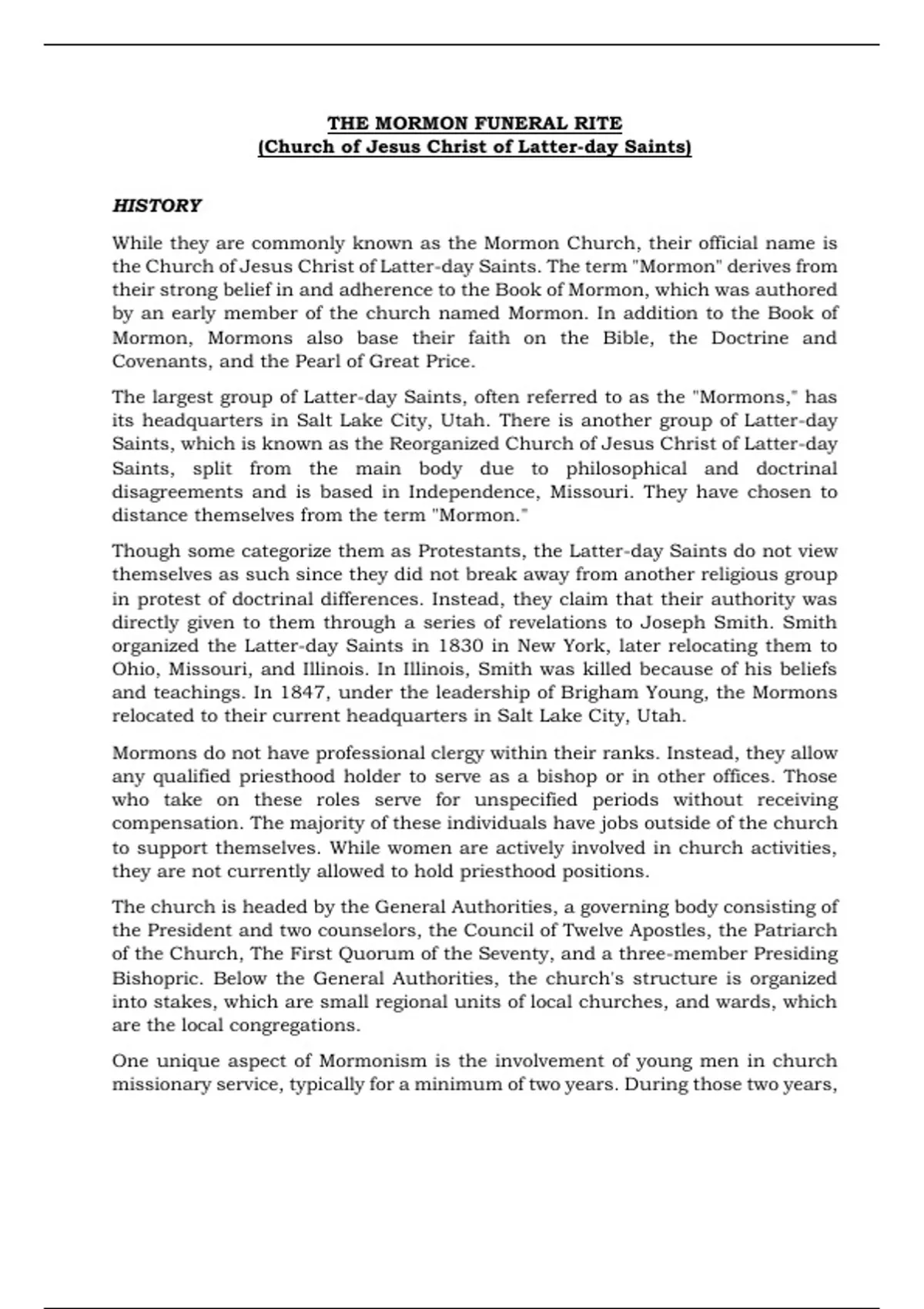 **Explore the Rich Tapestry of the Mormon Funeral Rituals** Delve into the profound and diverse world of funeral rituals with this meticulously crafted summary. This offers a brief dive into the customs, traditions, and historical evolution of certain funeral practices. Whether you're a student of anthropology, sociology, religious studies, Mortuary Sciences or simply curious about the human experience of death and mourning, this summary is your gateway to understanding: **Historical Perspectives:** Trace the origins of funeral rituals from ancient civilizations to contemporary practices, examining how beliefs and customs have shaped funeral rituals on these religions. **Notification and Mourning:** Explore the delicate art of notifying loved ones and the funeral home of a death, the cultural nuances of mourning periods, and the psychological significance of these rituals in coping with loss. **Visitation and Memorial Services:** Gain insights into the role of visitations and memorial services in different cultures and religions, their symbolic meanings. **Removal and Burial Customs:** Understand the solemn process of preparing and removing the deceased, burial rites, cremation practices, and other considerations of some funeral practices. **Visitation and Funeral Service:** Examine current trends in these funeral rites, including burials, memorials, and multicultural adaptations, reflecting evolving attitudes towards death and commemoration. Enriched with a mortician's insight, this summary equips you with an understanding of how human societies and certain religions confront mortality and celebrate life through diverse funeral rituals. Perfect for students, and anyone intrigued by the intersection of culture, tradition, and the human experience. --- This brief summary of the Mormon funeral rites promises to be a good starting point for anyone seeking to explore the profound and aspects of funeral rituals across certain cultures and/or religious beliefs.