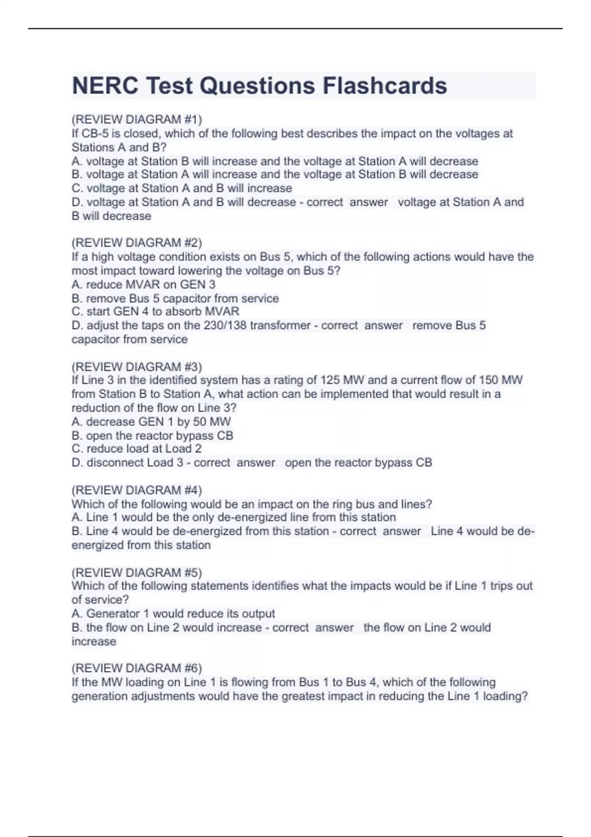 NERC Test Questions Flas(REVIEW DIAGRAM #1) If CB-5 is closed, which of the following best describes the impact on the voltages at Stations A and B? A. voltage at Station B will increase and the voltage at Station A will decrease B. voltage at Station A will increase and the voltage at Station B will decrease C. voltage at Station A and B will increase D. voltage at Station A and B will decrease - correct answer voltage at Station A and B will decrease (REVIEW DIAGRAM #2) If a high voltage condition exists on Bus 5, which of the following actions would have the most impact toward lowering the voltage on Bus 5? A. reduce MVAR on GEN 3 B. remove Bus 5 capacitor from service C. start GEN 4 to absorb MVAR D. adjust the taps on the 230/138 transformer - correct answer remove Bus 5 capacitor from service hcards with complete solution 2023