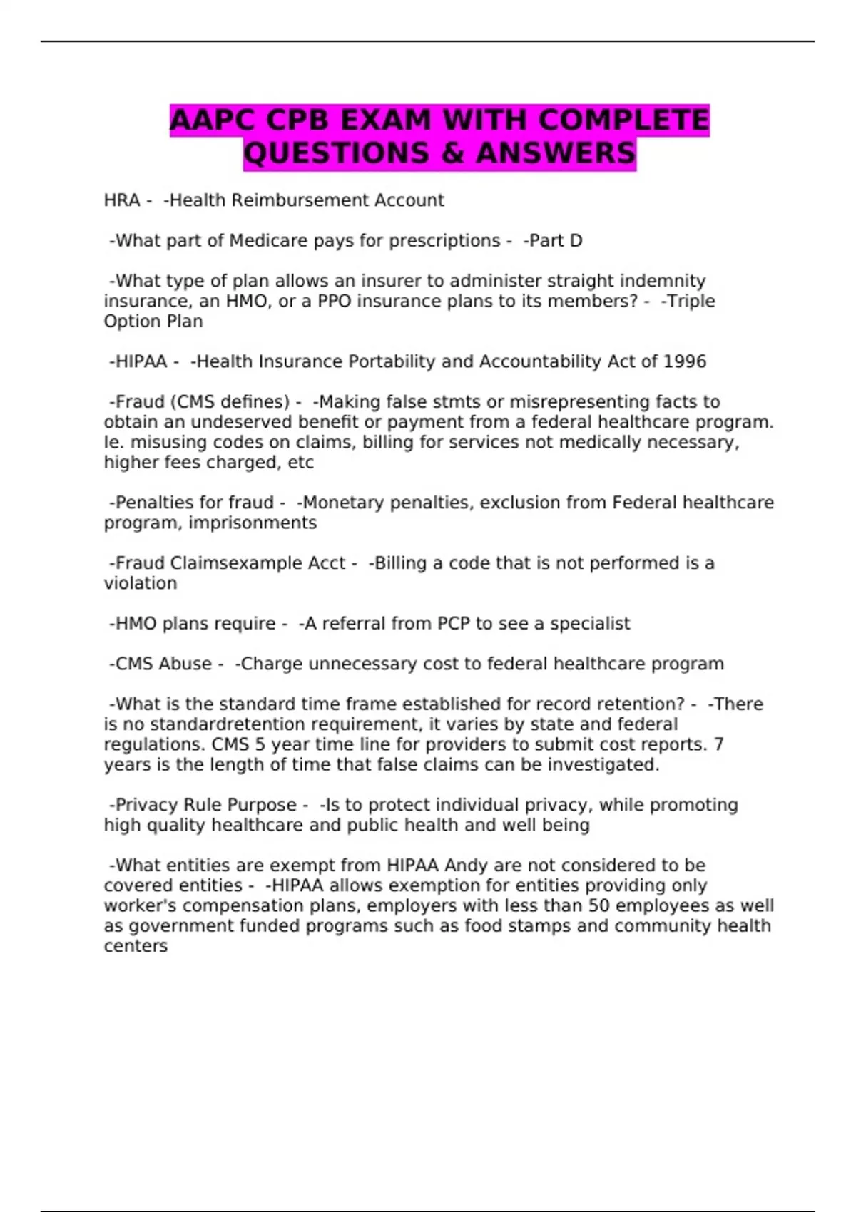 AAPC CPB EXAM WITH COMPLETE