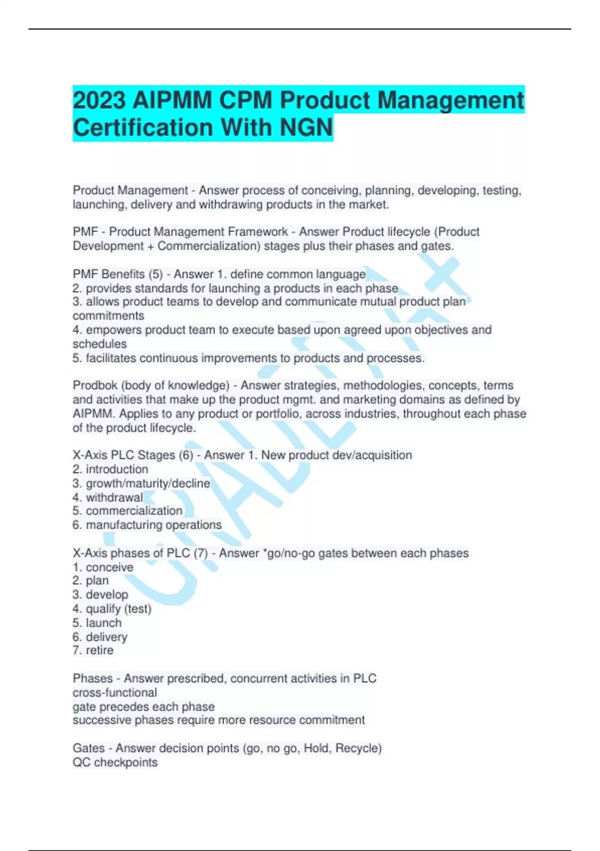 2023 AIPMM CPM Product Management Certification With NGN Product Management - Answer process of conceiving, planning, developing, testing, launching, delivery and withdrawing products in the market. PMF - Product Management Framework - Answer Product lifecycle (Product Development + Commercialization) stages plus their phases and gates. PMF Benefits (5) - Answer 1. define common language 2. provides standards for launching a products in each phase 3. allows product teams to develop and communicate mutual product plan commitments 4. empowers product team to execute based upon agreed upon objectives and schedules 5. facilitates continuous improvements to products and processes. Prodbok (body of knowledge) - Answer strategies, methodologies, concepts, terms and activities that make up the product mgmt. and marketing domains as defined by AIPMM. Applies to any product or portfolio, across industries, throughout each phase of the product lifecycle. X-Axis PLC Stages (6) - Answer 1. New product dev/acquisition 2. introduction 3. growth/maturity/decline 4. withdrawal 5. commercialization 6. manufacturing operations X-Axis phases of PLC (7) - Answer *go/no-go gates between each phases 1. conceive 2. plan 3. develop 4. qualify (test) 5. launch 6. delivery 7. retire Phases - Answer prescribed, concurrent activities in PLC cross-functional gate precedes each phase successive phases require more resource commitment Gates - Answer decision points (go, no go, Hold, Recycle) QC checkpoints Investment control checkpoints *Facilitate screening - evaluating new product ideas to reduce them into a smaller set. Y-Axis Key players on a product team (8) - Answer 1. Product Manager 2. Product Mktg. Manager 3. Project Manager 4. Business Analyst 5. Dev Manager 6. QA MAnager 7. Customer Support Mgr. 8. Sales Manager X/Y - Answer X=time Y=your focus XY cell = details of your focus at that time Y-Axis Knowledge Areas (5) - Answer 1. Business 2. Market 3. Customer 4. Product 5. Organization Product Life Cycle - PLC - Answer Manages stages that products go through from development to withdrawal from market. Helps you take the right action at the right time. Integrates people, data, processes and business system New Product Development + Commercialization Product Life Cycle Characteristics - Answer 1. Determines if each product has a different life cycle 2. Determines revenue earned 3. Contributes to strategic marketing plan Product Life Cycle Benefits - Answer 1. helps forecast and manage cash flow 2. helps identify when a product needs support, redesign, reinvigorated, or withdrawn. 3. helps in new product development and planning Product Portfolio - Answer range of products a company has in development or available for marketplace at one time Business Portfolio - Answer collection of businesses and products that make up a company. Portfolio Analysis - Answer tool which helps mgmt. identify and evaluate the various businesses which make up the company Strategic Business Unit - Answer unit of the company that has a separate mission and objectives and that can be planned independently from other company businesses New Product Development (NPD) - 1st half of PMF - Answer complete process of bringing a new product to market. Includes first 4 steps - conceive, plan, develop, qualify. For: 1. new product in new markets 2. new product in existing markets not previously targeted 3. enhance current product in existing product line.
