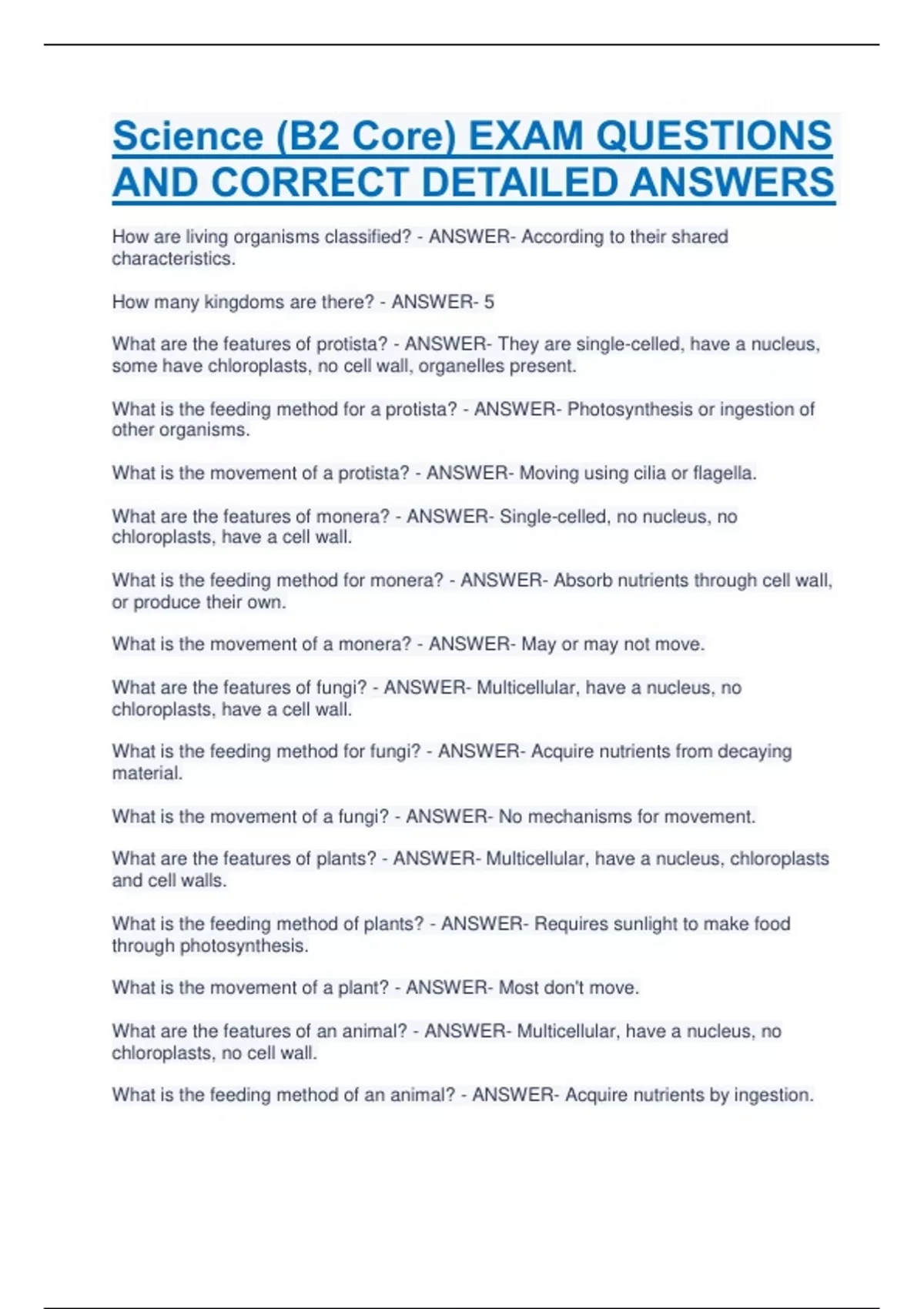 Science (B2 Core) EXAM QUESTIONS AND CORRECT DETAILED ANSWERS How are living organisms classified? - ANSWER- According to their shared characteristics. How many kingdoms are there? - ANSWER- 5 What are the features of protista? - ANSWER- They are single-celled, have a nucleus, some have chloroplasts, no cell wall, organelles present. What is the feeding method for a protista? - ANSWER- Photosynthesis or ingestion of other organisms. What is the movement of a protista? - ANSWER- Moving using cilia or flagella. What are the features of monera? - ANSWER- Single-celled, no nucleus, no chloroplasts, have a cell wall. What is the feeding method for monera? - ANSWER- Absorb nutrients through cell wall, or produce their own. What is the movement of a monera? - ANSWER- May or may not move. What are the features of fungi? - ANSWER- Multicellular, have a nucleus, no chloroplasts, have a cell wall. What is the feeding method for fungi? - ANSWER- Acquire nutrients from decaying material. What is the movement of a fungi? - ANSWER- No mechanisms for movement. What are the features of plants? - ANSWER- Multicellular, have a nucleus, chloroplasts and cell walls. What is the feeding method of plants? - ANSWER- Requires sunlight to make food through photosynthesis. What is the movement of a plant? - ANSWER- Most don't move. What are the features of an animal? - ANSWER- Multicellular, have a nucleus, no chloroplasts, no cell wall. What is the feeding method of an animal? - ANSWER- Acquire nutrients by ingestion. What is the movement of an animal? - ANSWER- Moving using cilia, flagella or muscles. What is a hybrid? - ANSWER- When two different species mate and reproduce. Why can't hybrids be called new species? - ANSWER- They are infertile. Why is it difficult to classify organisms? - ANSWER- The variety of life is a continuous spectrum which makes it difficult to place them in distinct groups. What are the difficulties of classifying organisms? - ANSWER- Organisms that only reproduce asexually can be hard to classify and organisms are constantly changing to suit their environment. How can evolutionary relationships be displayed? - ANSWER- In evolutionary trees. What are the 5 kingdoms divided into? - ANSWER- Phyla. What is each phylum divided into? - ANSWER- Class. What is each class divided into? - ANSWER- Order. What is each order divided into? - ANSWER- Family.