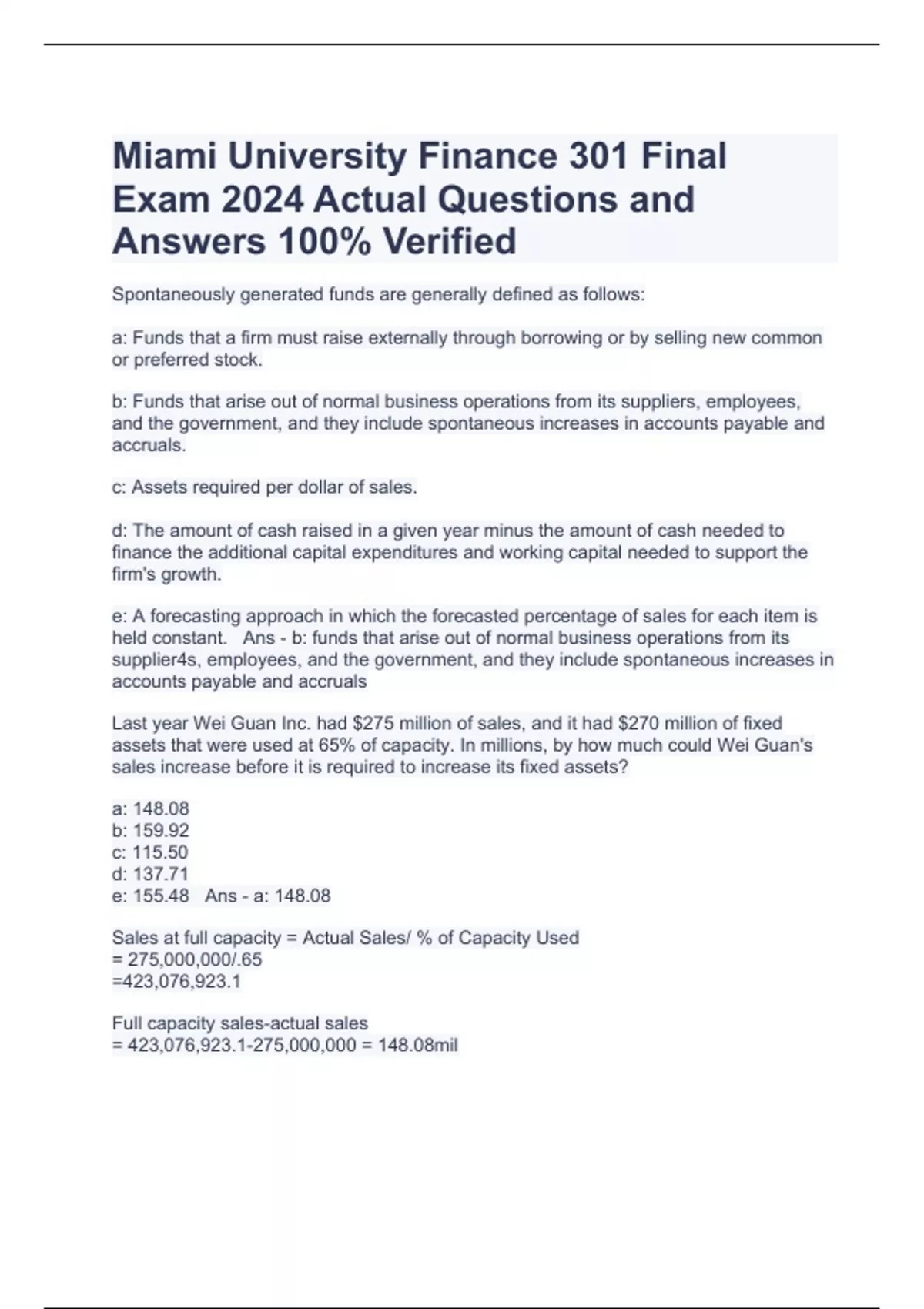 Miami University Finance 301 Final Exam 2024 Actual Questions and Answers 100% Verified