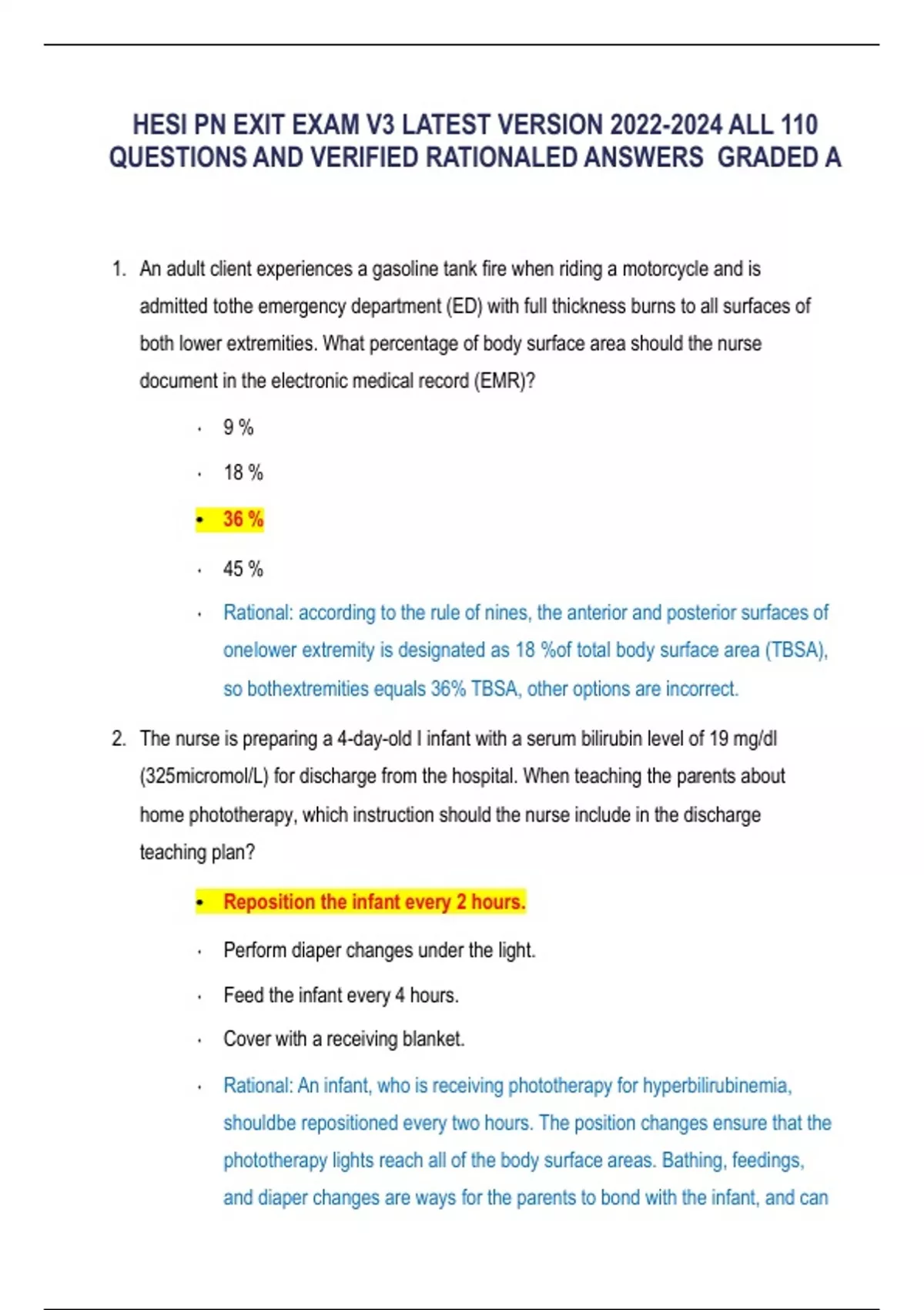 HESI PN EXIT EXAM V3 LATEST VERSION ALL 110 QUESTIONS AND VERIFIED RATIONALED ANSWERS GRADED A 1. An adult client experiences a gasoline tank fire when riding a motorcycle and is admitted tothe emergency department (ED) with full thickness burns to all surfaces of both lower extremities. What percentage of body surface area should the nurse document in the electronic medical record (EMR)? • 9 % • 18 % • 36 % • 45 % • Rational: according to the rule of nines, the anterior and posterior surfaces of onelower extremity is designated as 18 %of total body surface area (TBSA), so bothextremities equals 36% TBSA, other options are incorrect.