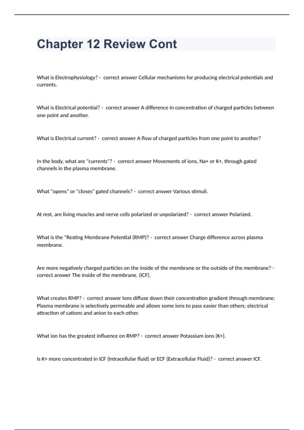 Chapter 12 Review Cont What is Electrophysiology? - correct answer Cellular mechanisms for producing electrical potentials and currents. What is Electrical potential? - correct answer A difference in concentration of charged particles between one point and another. What is Electrical current? - correct answer A flow of charged particles from one point to another? In the body, what are "currents"? - correct answer Movements of ions, Na+ or K+, through gated channels in the plasma membrane. What "opens" or "closes" gated channels? - correct answer Various stimuli. At rest, are living muscles and nerve cells polarized or unpolarized? - correct answer Polarized. What is the "Resting Membrane Potential (RMP)? - correct answer Charge difference across plasma membrane. Are more negatively charged particles on the inside of the membrane or the outside of the membrane? - correct answer The inside of the membrane. (ICF). What creates RMP? - correct answer Ions diffuse down their concentration gradient through membrane; Plasma membrane is selectively permeable and allows some ions to pass easier than others; electrical attraction of cations and anion to each other. What ion has the greatest influence on RMP? - correct answer Potassium ions (K+).