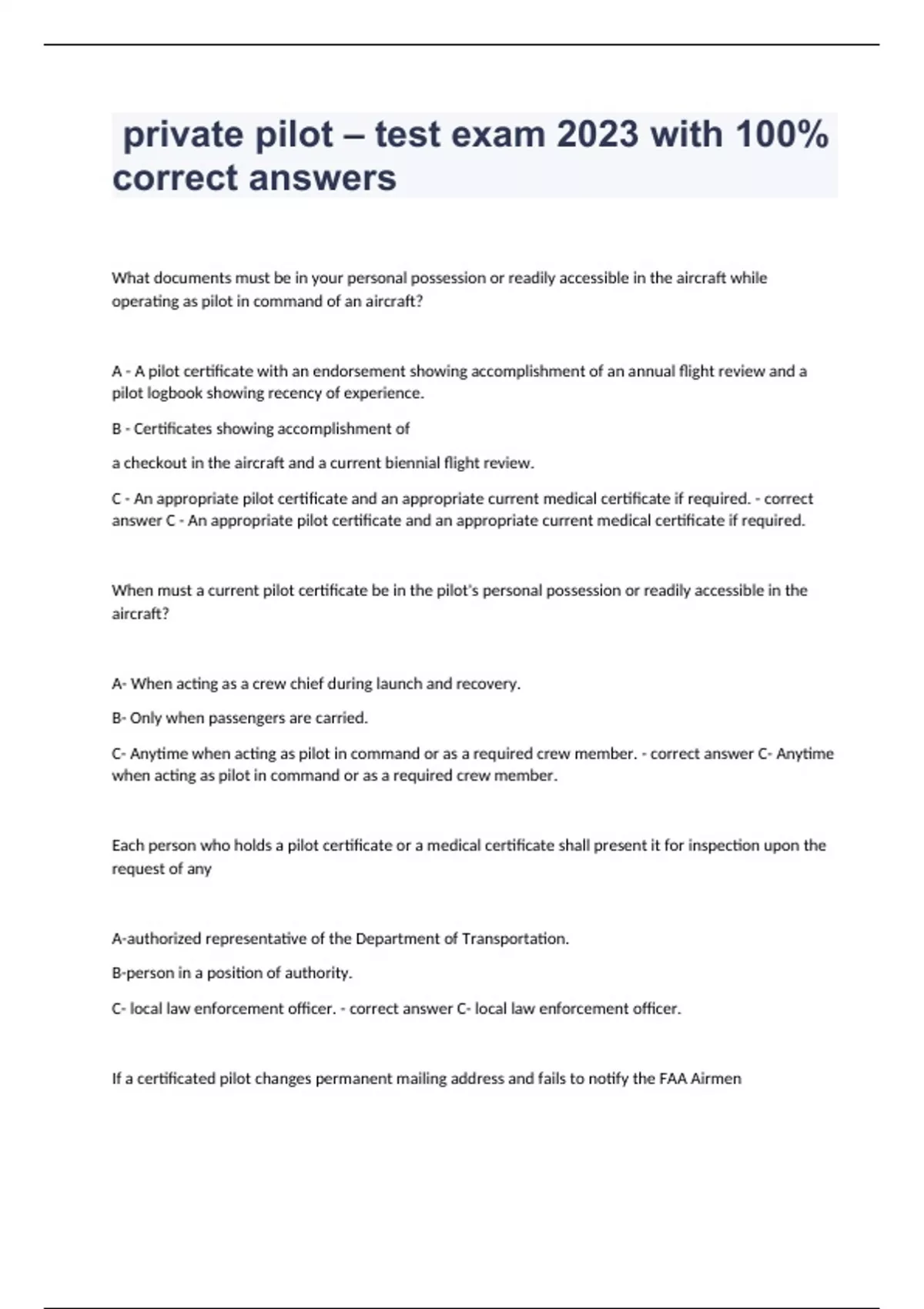 private pilot test exam 2023 with 100 correct a