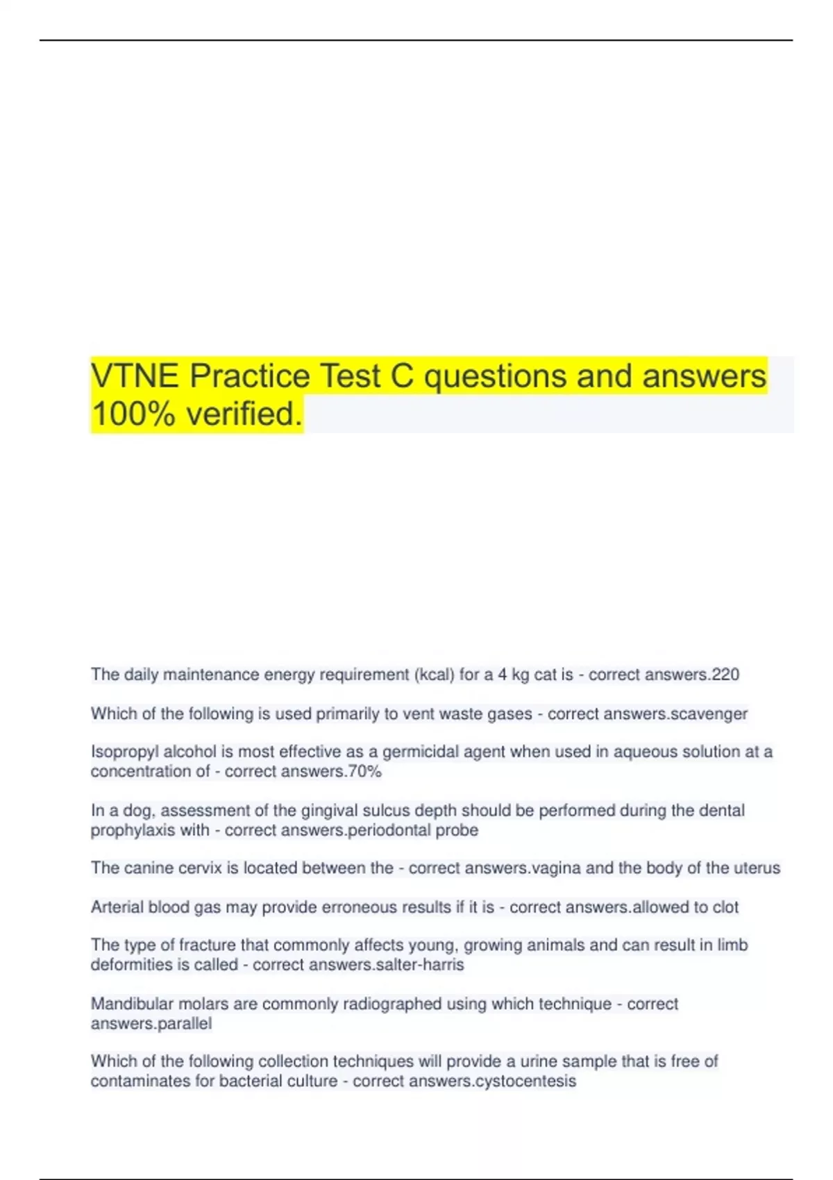 VTNE Practice Test C questions and answers 100% verified. The daily maintenance energy requirement (kcal) for a 4 kg cat is - correct answers.220 Which of the following is used primarily to vent waste gases - correct nger Isopropyl alcohol is most effective as a germicidal agent when used in aqueous solution at a concentration of - correct answers.70% In a dog, assessment of the gingival sulcus depth should be performed during the dental prophylaxis with - correct dontal probe The canine cervix is located between the - correct a and the body of the uterus Arterial blood gas may provide erroneous results if it is - correct ed to clot The type of fracture that commonly affects young, growing animals and can result in limb deformities is called - correct r-harris Mandibular molars are commonly radiographed using which technique - correct lel Which of the following collection techniques will provide a urine sample that is free of contaminates for bacterial culture - correct centesis Which active ingredient controls flea populations by breaking the life cycle at the egg stage - correct uron The benefit of selective COX-2 inhibitors in the treatment of inflammation is they - correct anti-inflammatory properties, but do not alter the gasteric protection provided by COX-1 The most appropriate position to recover cattle from general anesthesia is - correct al recumbency Which of the following drugs could add to the adverse effects of chocolate toxicity - correct hylline A rodenticide that can depress clotting factors for 3-4 weeks is - correct facoum A rabbit presents with otoacariasis. Which of the following is the most likely causitive agent - correct answers.Psoroptes cuniculi During a manufacturing shortage of Dichlorvos, which of the following drugs could a veterinarian prescribe as a substitute in the same drug class - correct lorfon Which of the following is known as the Wolf tooth in an equine - correct premolar Which is the best option for long term pain management of hip dysplasia in an 8-year old golden retriever with Cushings Disease - correct answers.NSAIDS The proper needle placement for a lumbar myelogram is between the - correct answers.4th and 5th lumbar vertebrae Which of the following is the most likely source of bovine viral diarrhea in a herd of cattle - correct stently infected animals Which exposure factor primarily controls the quantity of x-rays produced - correct answers.mA Which bacterial disease is spread by contaminated humans or objects and is easily transmitted between horses - correct gles The strongest analgesia is achieved by drugs that stimulate which of the following receptors - correct answers.Mu If a fentanyl transdermal patch is being used to deliver long term analgesia, which would inhibit the analgesic effect - correct phanol The Coggins test is used to detect which equine disease - correct tious anemia Sedation ordered for a 13-lb cat at 11mg/kg is supplied as a liquid with a concentration of 100 mg/mL. What volume is needed for this patient? - correct answers.0.65 mL The average gestation period in a hamster is approximately - correct answers.16 days Which of the following suture patterns is considered continuous - correct interlocking Which of the following could be seen in a patient with diabetic ketoacidosis - correct nsulinemia, decreased potassium levels The correct order for the steps in the pain pathway is - correct duction, transmission, modulation, and perception How often should a geriatric dog with chronic osteoarthritis be evaluated? A. Every month B. Every six months C. Every 12 months D. Evaluation not needed - correct answers.A. Every month Long-acting barbiturates are administered to dogs and cats as: A. anthelmintics. B. analgesics. C. anticholinergics. D. anticonvulsants. - correct answers.D. anticonvulsants. To maximally improve visualization during an abdominal exploratory procedure, which retractor should be used? A. Balfour B. Senn C. Gelpi D. US Army - correct answers.A. Balfour The part of the control panel on a standard X-ray machine that provides manual adjustment of the transformer to allow for inconsistent electrical output is the: A. voltage compensator. B. kilovoltage selector. C. timer. D. exposure button. - correct answers.A. voltage compensator. Which of the following drugs is used to suppress a cough? A. Anti-inflammatory B. Antihistamine C. Anticholinergic D. Antitussive - correct answers.D. Antitussive Which would be an appropriate action to take if a patient is hypothermic (less than 35° C/95° F) during anesthesia? A. Administer an anticholinergic. B. Increase the intravenous fluid rate.