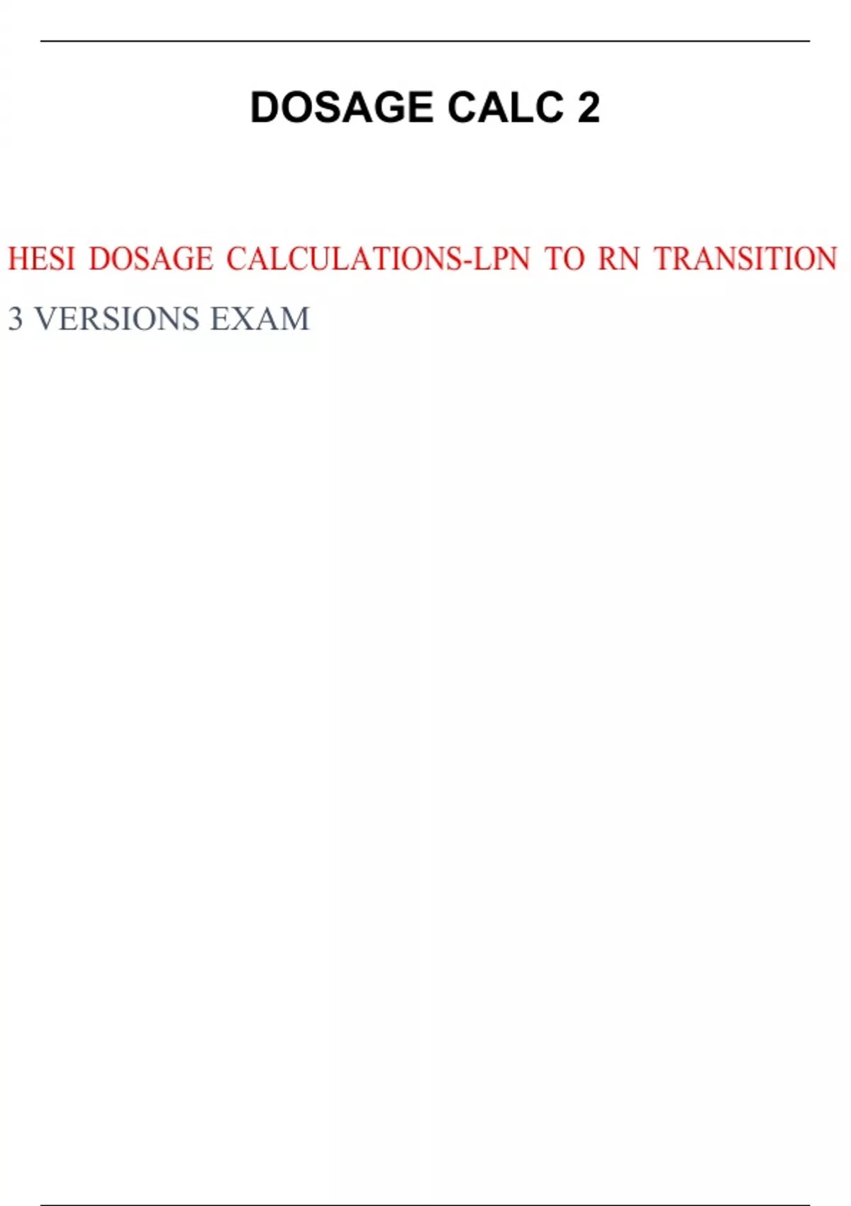 HESI DOSAGE CALCULATIONS-LPN TO RN TRANSITION 3 VERSIONS EXAM REAL EXAM SCORED 1200