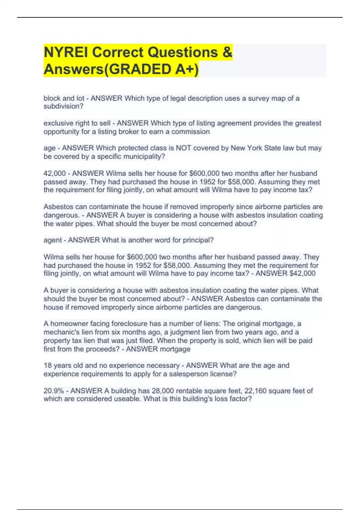 block and lot - ANSWER Which type of legal description uses a survey map of a subdivision? exclusive right to sell - ANSWER Which type of listing agreement provides the greatest opportunity for a listing broker to earn a commission age - ANSWER Which protected class is NOT covered by New York State law but may be covered by a specific municipality? 42,000 - ANSWER Wilma sells her house for $600,000 two months after her husband passed away. They had purchased the house in 1952 for $58,000. Assuming they met the requirement for filing jointly, on what amount will Wilma have to pay income tax? Asbestos can contaminate the house if removed improperly since airborne particles are dangerous. - ANSWER A buyer is considering a house with asbestos insulation coating the water pipes. What should the buyer be most concerned about? agent - ANSWER What is another word for principal? Wilma sells her house for $600,000 two months after her husband passed away. They had purchased the house in 1952 for $58,000. Assuming they met the requirement for filing jointly, on what amount will Wilma have to pay income tax? - ANSWER $42,000 A buyer is considering a house with asbestos insulation coating the water pipes. What should the buyer be most concerned about? - ANSWER Asbestos can contaminate the house if removed improperly since airborne particles are dangerous. A homeowner facing foreclosure has a number of liens: The original mortgage, a mechanic's lien from six months ago, a judgment lien from two years ago, and a property tax lien that was just filed. When the property is sold, which lien will be paid first from the proceeds? - ANSWER mortgage NYREI Correct Questions & Answers(GRADED A+)