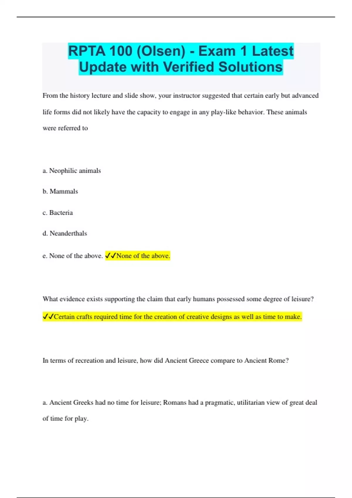 RPTA 100 (Olsen) - Exam 1 Latest Update with Verified Solutions From the history lecture and slide show, your instructor suggested that certain early but advanced life forms did not likely have the capacity to engage in any play-like behavior. These animals were referred to a. Neophilic animals b. Mammals c. Bacteria d. Neanderthals e. None of the above. None of the above. What evidence exists supporting the claim that early humans possessed some degree of leisure? Certain crafts required time for the creation of creative designs as well as time to make. In terms of recreation and leisure, how did Ancient Greece compare to Ancient Rome? a. Ancient Greeks had no time for leisure; Romans had a pragmatic, utilitarian view of great deal of time for play. b. Ancient Greeks viewed leisure as undesirable; Romans saw it as entertainment and pleasure seeking characterized ancient Rome. c. Ancient Greeks tended to be pleasure seekers; ancient Romans focused more on culture and art. e. None of the above. e. None of the above. Why is the Renaissance viewed as an important historical landmark in leisure history? a. It marked the beginning of the Dark Ages. b. It restored leisure to a status somewhat similar to that held in prehistoric times. c. It marked a return to cultural activities such as dance, theatre, and music. d. It produced many remarkable thinkers, artists, and philosophers. e. Both C and D e. Both C and D What is the significance of the Boston Sandgardens in relation to leisure history? Most historians give credit to the Boston Sandgardens as the inception of the recreation movement. During the late 19th century and the early 20th century, a number of important events occurred that enabled the recreation movement, and the playground movement, to make great strides. What were some of these events? a. In 1906, a group of socially conscious leaders met in Washington D.C. to resolve some of the recreation and leisure problems of the day. This led to the founding of the American Playground Association. The name was later changed in 1911 to the Playground and Recreation Association b. In 1906, Congress passed the Antiquities Act, giving the President the power to designate national monuments and protect them from being destroyed c. The establishment of the National Park Service. d. Agencies were established during the Great Depression that led to the creation of parks and recreation facilities, many of which we use today. e.All of the above. e.All of the above. The word "philosophy" in its literal Greek sense means ____________ love of wisdom Philsophers often use the following kind of logic: Premise: Bill is home. Premise: Bill's car is in the driveway. Conclusion: Whenever Bill is home is car is in the driveway. This an example of which of the following: Deductive reasoning A person's view of metaphysics and epistemology play a role in how he or she views leisure. What is the difference between metaphysics and epistemology? Metaphysics: concerned with that which is not readily discerned by the senses; epistemology: concerned with examining the validity of that which we call knowledge. In a leisure philosophy, axiology plays an important role? How does the essay on philosophy define axiology? That branch of philosophy that deals with the nature of values. It is divided into two categories: 1) Ethics is concerned with the questions of right and wrong. 2) Aesthetics is concerned with the study of beauty. Which of the following philosophies views pleasure as invariably good? a. Capitalism b. Existentialism c. Dialectical materialism d. Pragmatism e. Hedonism e. Hedonism In what substantive way does religion differ from philosophy? Religion requires faith; philosophy reason. What is the first step in the scientific method? identify the question for study Hypothesis testing is an important part of the research method, which of the following is a correct statement regarding the term hypothesis? a. Literally means "under-placing" b. It is presumed relationship between variables; an educated guess. c. It is what is tested in a research study d. It is considered a possible answer to a research question e. All of the above are correct. e. All of the above are correct. In a leisure research study looking at the influence of television on childhood obesity, what is the independent variable? The independent variable is childhood obesity. What is an dependent variable? The presumed outcomes What is a confounding variable? A variable that might have an unknown or unexpected influence on a dependent variable. What is validity? The capacity of a study or test to measure what it purports (intends or claims) to study. In a leisure research study, what is reliability? The ability of a test to get the same results over repeated applications. Can a leisure research test be reliable but not valid? Yes. You can get the same incorrect results over and over again. Of the following statements regarding random samples in leisure research, which is/are correct? a. Often the populations under study are too large to involve everyone in the research. b. Nonrandom samples may not represent the larger population from which they derive. c. A random sample enhances the probability that results can be generalized to the larger population. d. All of the above are correct. d. All of the above are correct. The leisure research continuum as shown in the slide presentation ranges from between what types of research? subjective and objective 23. Why do we discuss philosophy and science in a "leisure" class? a. One of the goals of general education is to promote critical thinking, understanding the fundamentals of philosophy and science can help to promote clear and reasoned thinking regarding important life issues. b. Since the course draws from both philosophy and science it help to have a background in both. c. Science can help us discern valid information; philosophy can help us assign value to such information. d. All of the above