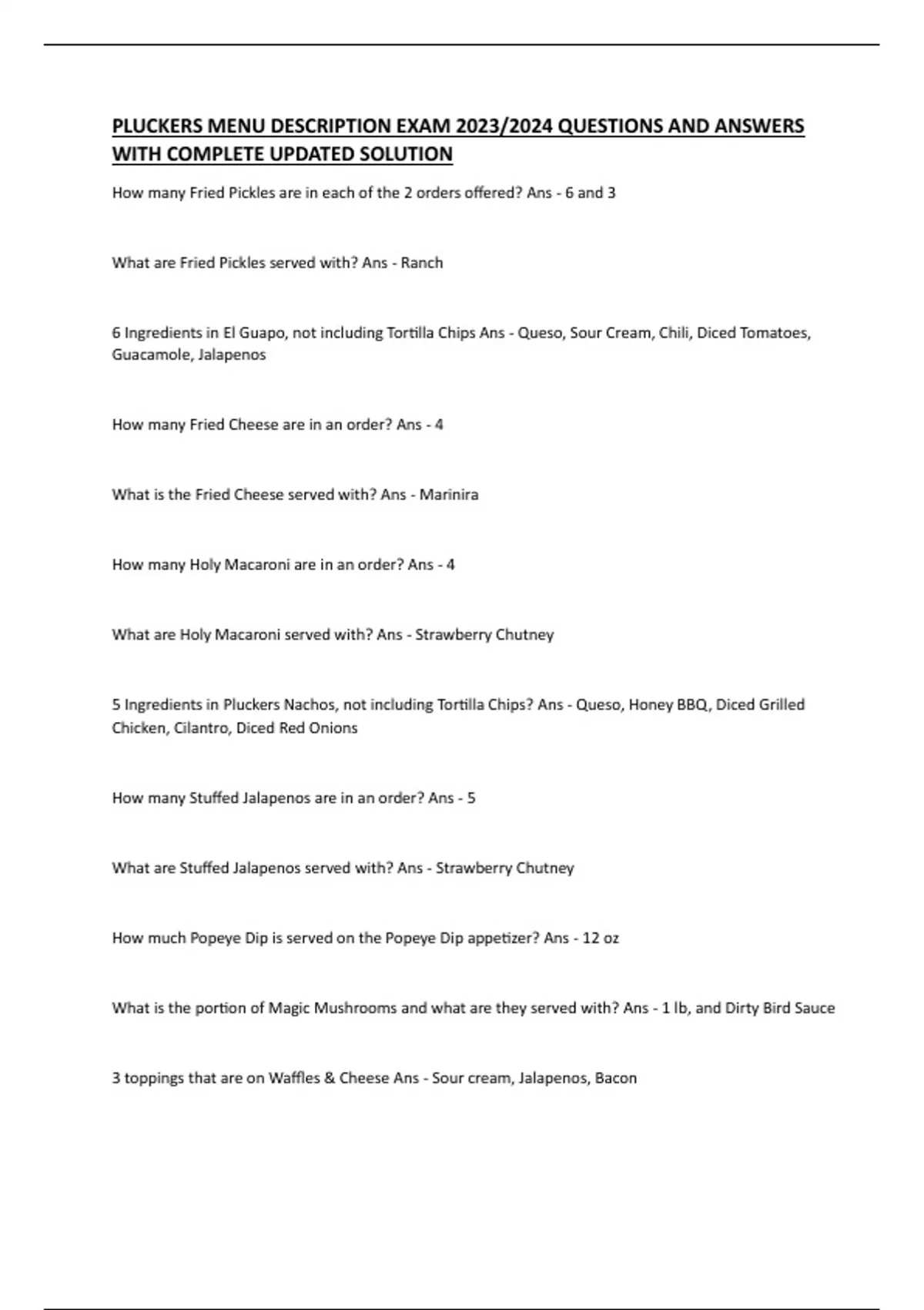 PLUCKERS MENU DESCRIPTION EXAM 2023/2024 QUESTIONS AND ANSWERS