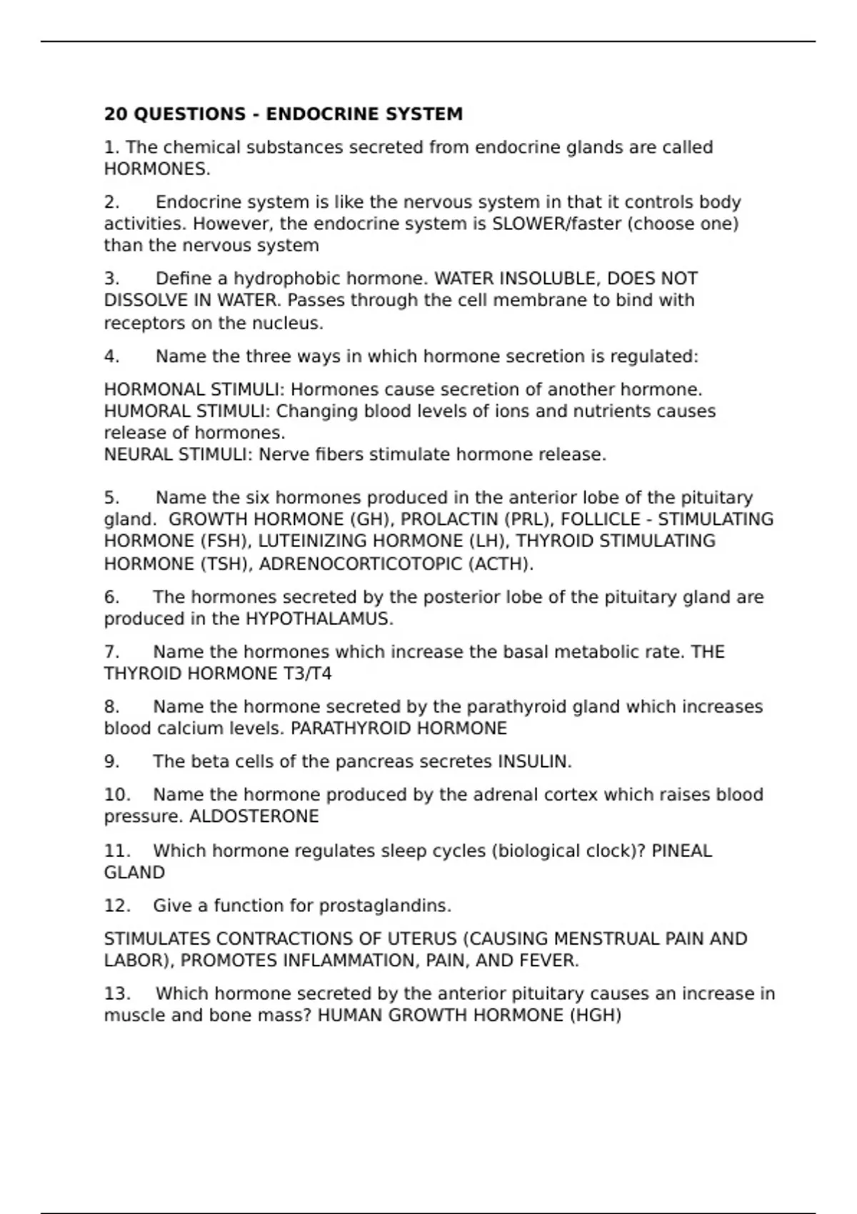 Endocrine System - 20 Questions and Answers
