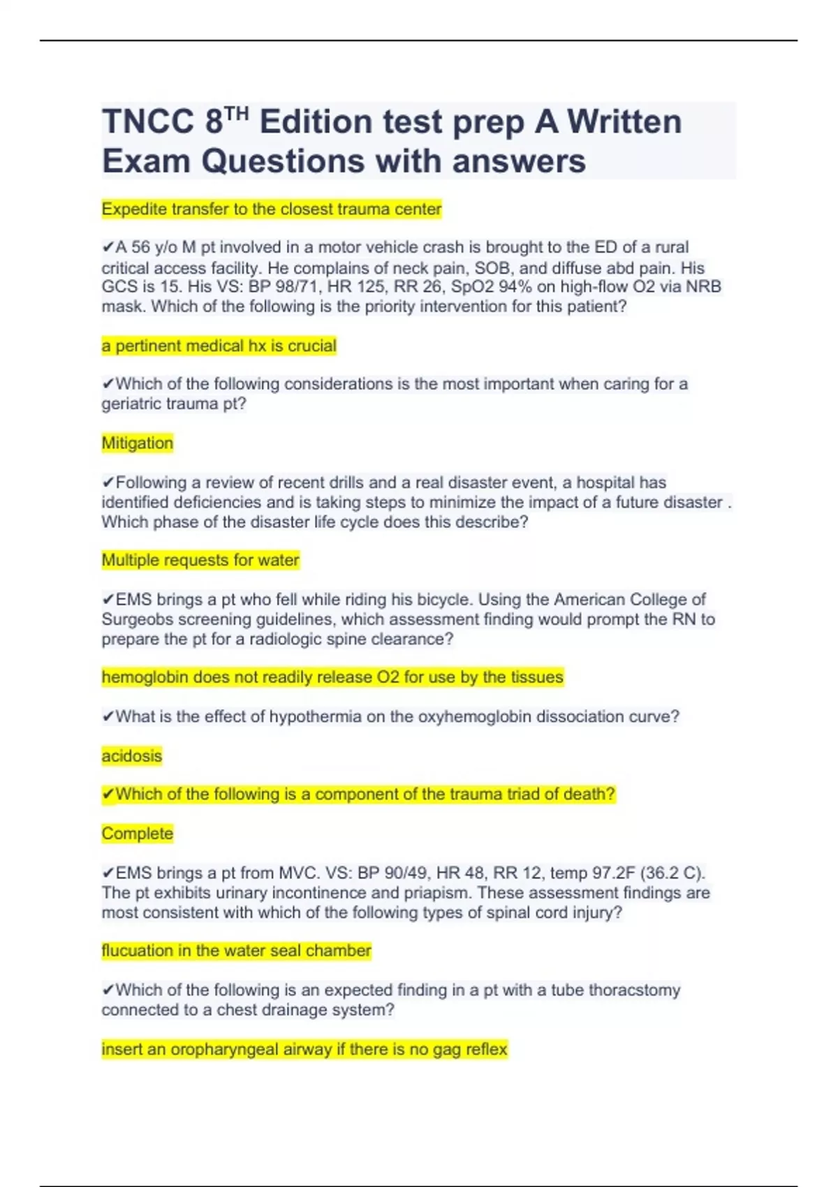 TNCC 8TH Edition test prep A Written Exam Questions with answers.