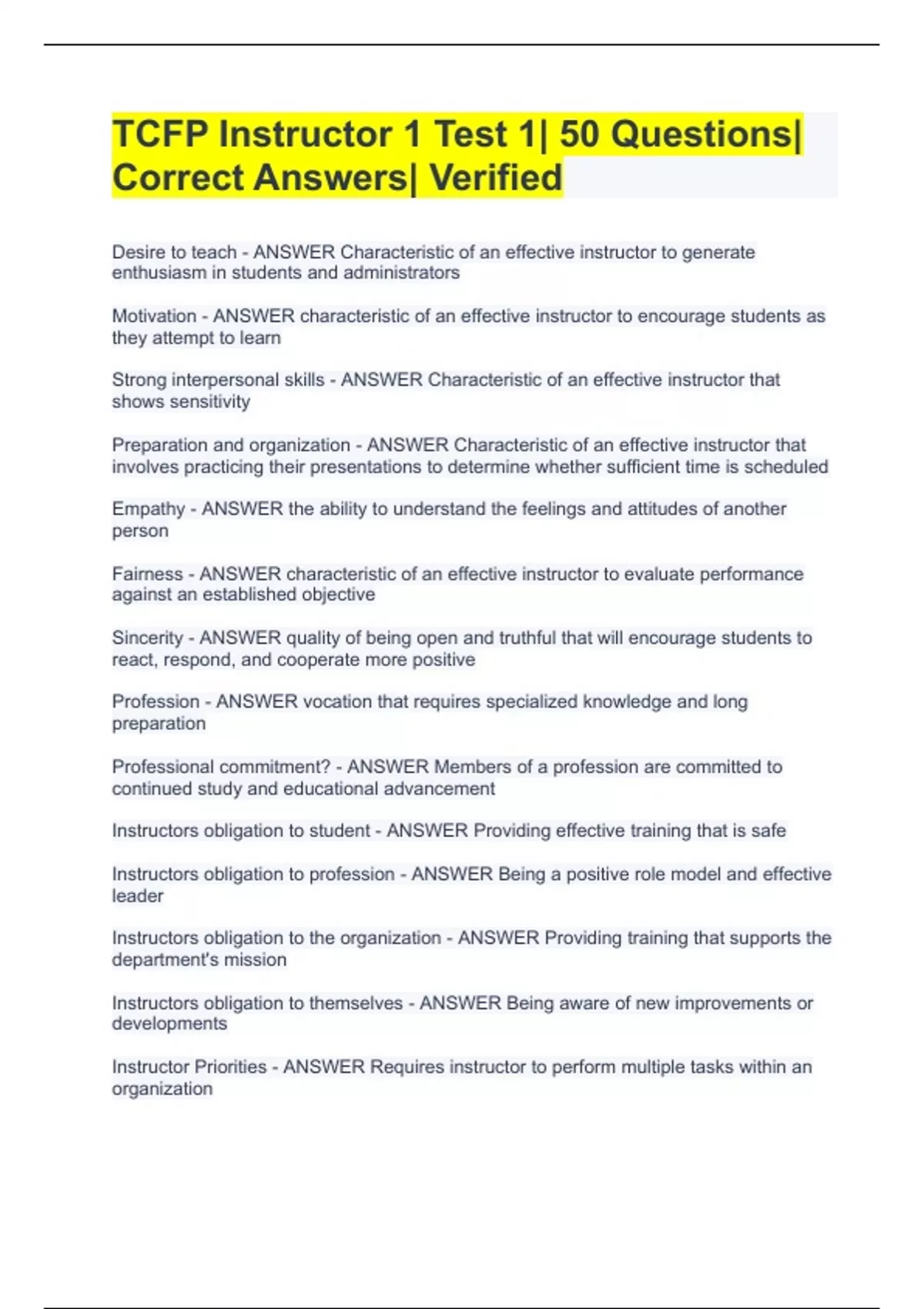TCFP Instructor 1 Test 1| 50 Questions| Correct Answers| Verified