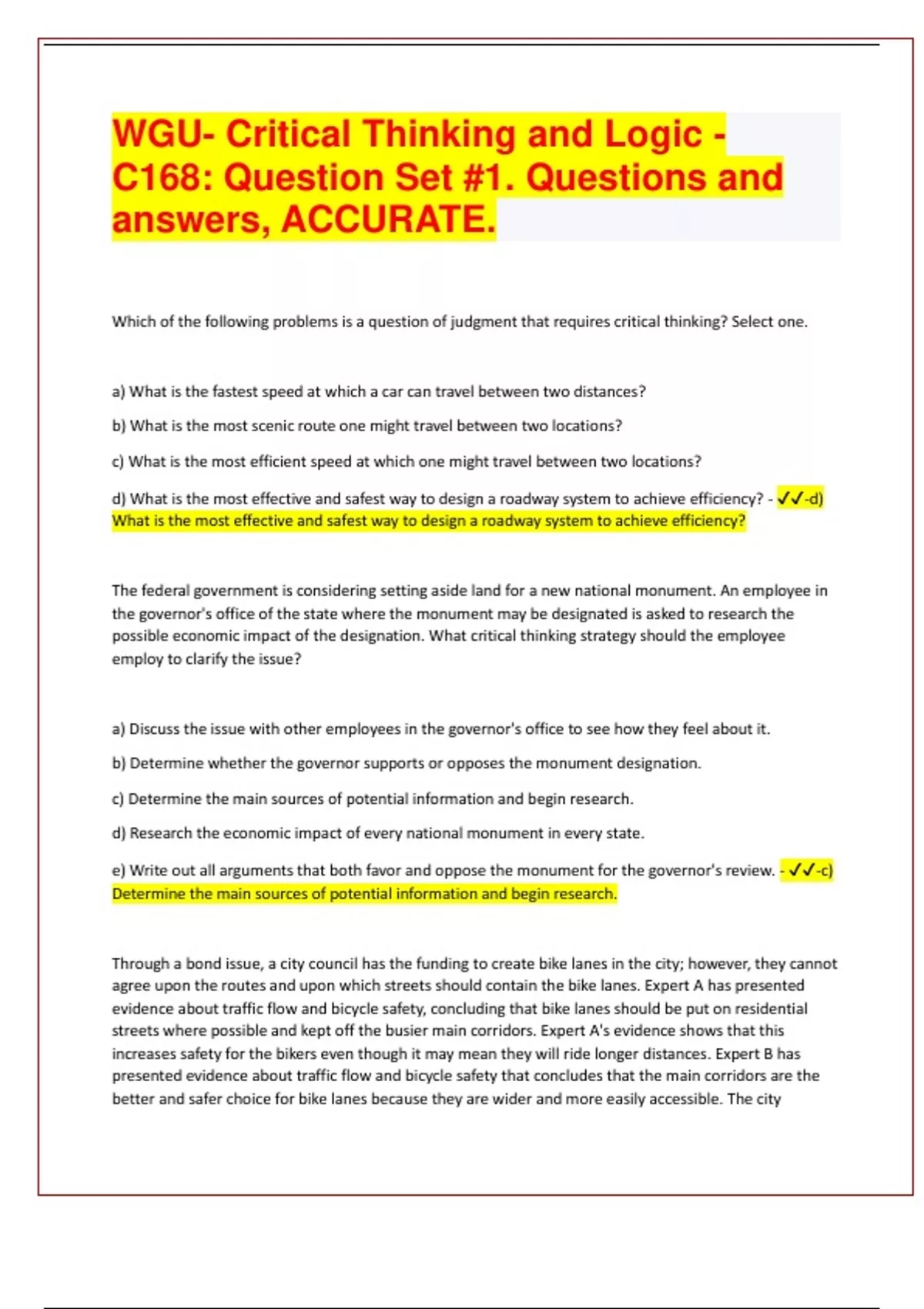 Which of the following problems is a question of judgment that requires critical thinking? Select one. a) What is the fastest speed at which a car can travel between two distances? b) What is the most scenic route one might travel between two locations? c) What is the most efficient speed at which one might travel between two locations? d) What is the most effective and safest way to design a roadway system to achieve efficiency? - -d) What is the most effective and safest way to design a roadway system to achieve efficiency? The federal government is considering setting aside land for a new national monument. An employee in the governor's office of the state where the monument may be designated is asked to research the possible economic impact of the designation. What critical thinking strategy should the employee employ to clarify the issue? a) Discuss the issue with other employees in the governor's office to see how they feel about it. b) Determine whether the governor supports or opposes the monument designation. c) Determine the main sources of potential information and begin research. d) Research the economic impact of every national monument in every state. e) Write out all arguments that both favor and oppose the monument for the governor's review. - -c) Determine the main sources of potential information and begin research. Through a bond issue, a city council has the funding to create bike lanes in the city; however, they cannot agree upon the routes and upon which streets should contain the bike lanes. Expert A has presented evidence about traffic flow and bicycle safety, concluding that bike lanes should be put on residential streets where possible and kept off the busier main corridors. Expert A's evidence shows that this increases safety for the bikers even though it may mean they will ride longer distances. Expert B has presented evidence about traffic flow and bicycle safety that concludes that the main corridors are the better and safer choice for bike lanes because they are wider and more easily accessible. The citydecides to go with Expert A's evidence and installs the bike lanes on residential streets. Shortly after the bike lanes open, a biker is seriously injured when hit by a car backing out of a driveway. Which of the following statements are true? a) Expert A's evidence was accurate, and expert B's evidence was inaccurate. b) Expert B's evidence was accurate, and expert A's evidence was inaccurate. c) The evidence of both expert A and expert B was accurate. d) The evidence of both expert A and expert B was inaccurate. e) It is not possible to know the accuracy of either expert's evidence from the information given. f) Expert A's evidence was relevant, and expert B's evidence was irrelevant. g) Expert B's evidence was relevant, and expert A's evidence was irrelevant. h) The evidence of both experts was relevant. i) The evidence of both experts was irrelevant. j) It is not possible to determine relevancy of either expert's evidence from the information given