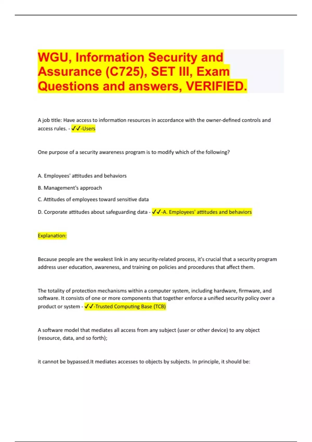 A job title: Have access to information resources in accordance with the owner-defined controls and access rules. - -Users One purpose of a security awareness program is to modify which of the following? A. Employees' attitudes and behaviors B. Management's approach C. Attitudes of employees toward sensitive data D. Corporate attitudes about safeguarding data - -A. Employees' attitudes and behaviors Explanation: Because people are the weakest link in any security-related process, it's crucial that a security program address user education, awareness, and training on policies and procedures that affect them. The totality of protection mechanisms within a computer system, including hardware, firmware, and software. It consists of one or more components that together enforce a unified security policy over a product or system - -Trusted Computing Base (TCB) A software model that mediates all access from any subject (user or other device) to any object (resource, data, and so forth); it cannot be bypassed.It mediates accesses to objects by subjects. In principle, it should be: