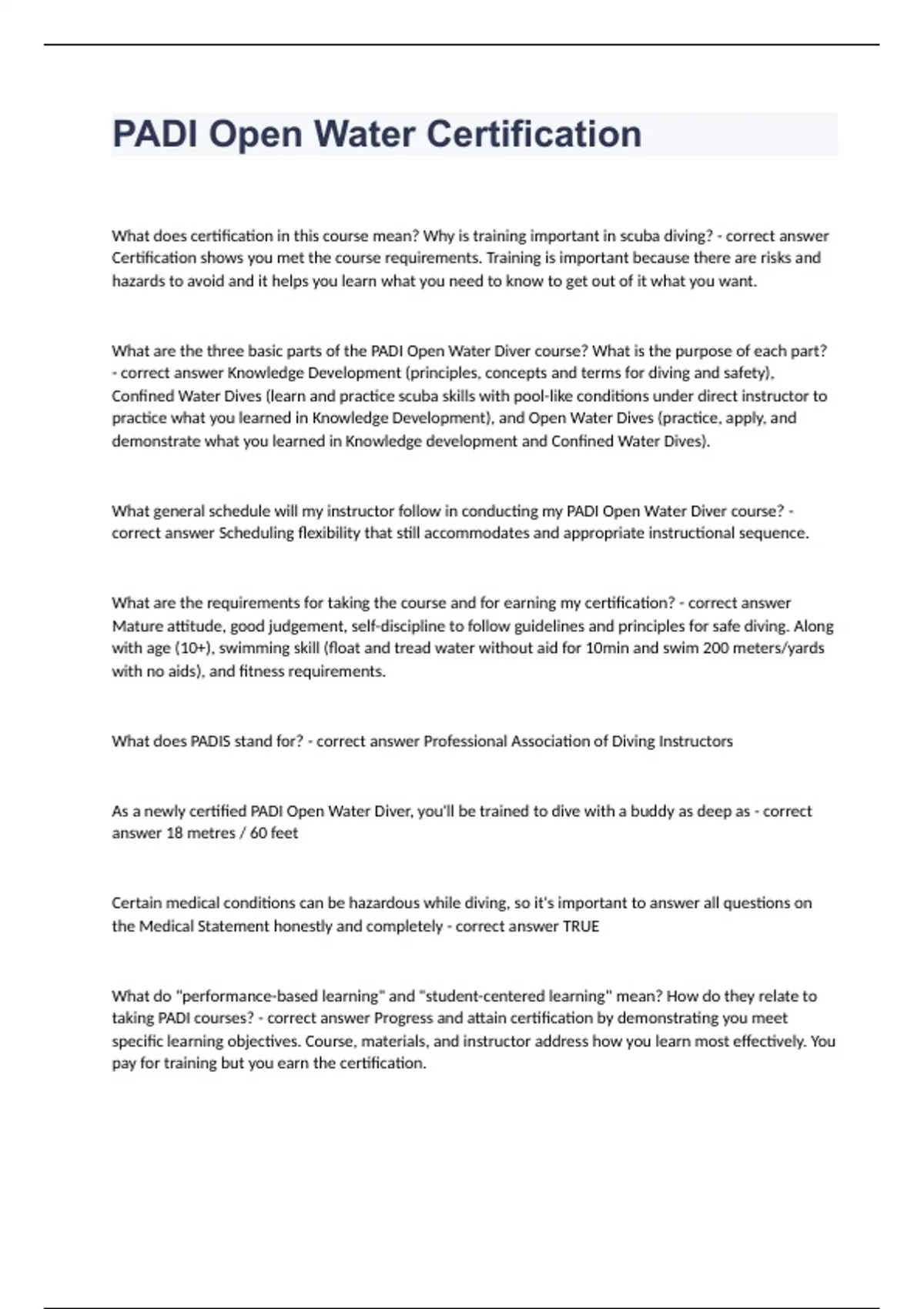PADI Open Water CertificationWhat does certification in this course mean? Why is training important in scuba diving? - correct answer Certification shows you met the course requirements. Training is important because there are risks and hazards to avoid and it helps you learn what you need to know to get out of it what you want. What are the three basic parts of the PADI Open Water Diver course? What is the purpose of each part? - correct answer Knowledge Development (principles, concepts and terms for diving and safety), Confined Water Dives (learn and practice scuba skills with pool-like conditions under direct instructor to practice what you learned in Knowledge Development), and Open Water Dives (practice, apply, and demonstrate what you learned in Knowledge development and Confined Water Dives). What general schedule will my instructor follow in conducting my PADI Open Water Diver course? - correct answer Scheduling flexibility that still accommodates and appropriate instructional sequence. What are the requirements for taking the course and for earning my certification? - correct answer Mature attitude, good judgement, self-discipline to follow guidelines and principles for safe diving. Along with age (10+), swimming skill (float and tread water without aid for 10min and swim 200 meters/yards with no aids), and fitness requirements. What does PADIS stand for? - correct answer Professional Association of Diving Instructors As a newly certified PADI Open Water Diver, you'll be trained to dive with a buddy as deep as - correct answer 18 metres / 60 feet Certain medical conditions can be hazardous while diving, so it's important to answer all questions on the Medical Statement honestly and completely - correct answer TRUE What do "performance-based learning" and "student-centered learning" mean? How do they relate to taking PADI courses? - correct answer Progress and attain certification by demonstrating you meet specific learning objectives. Course, materials, and instructor address how you learn most effectively. You pay for training but you earn the certification. How can I learn most effectively during Knowledge Development and the Confined Water and Open Water Dives? - correct answer Answer questions as you go through the sections. Ask questions and tell the instructor how you feel. Pay attention during briefings, come prepared. How does getting my PADI Dive Center or Resort to help me with my equipment help me learn to dive and enjoy diving better? - correct answer builds habits and confidence; learn to tailor and refine your equipment during the course. What are the four E's? - correct answer Equipment, education, experience, and environment PADI courses are performance-based. This means that to be certified, you must - correct answer meet specific performance requirements Failure to complete assigned independent study can create significant delays, and my instructor may have to cancel and reschedule sessions until I complete the assignment. - correct answer TRUE What are 11 reasons to dive? - correct answer (1)adventuring and exploring, (2) enjoying and observing nature, (3) spending time doing something with friends and/or family, (4) getting out on the water, (5) taking photos and videos, (6) investigating sunken ships, (7) new personal challenges, (8) becoming familiar with new technology, (9) making new friends, (10) difference in environmental conservation, (11) enjoying a different world What are five things I can do before the end of the course to help me continue to enjoy and be involved with diving after certification? - correct answer (1) Join and participate in your local dive center's dive club and/or social events, (2) enroll in a PADI course, (3) sign up for a dive trip, (4) invest in your first scuba equipment, (5) take part in a local environmental project or event Why should I seek an orientation, supervision and/or additional training when diving in a new dive environment? - correct answer helps you enjoy diving by assuring you are comfortable, avoid problems, and know what to look for that's interesting; teaches about special techniques you may need When diving in a new dive environment, two benefits of seeking an orientation, supervision and/or additional training are that it helps me avoid problems and that it helps me enjoy the dive more. - correct answer TRUE