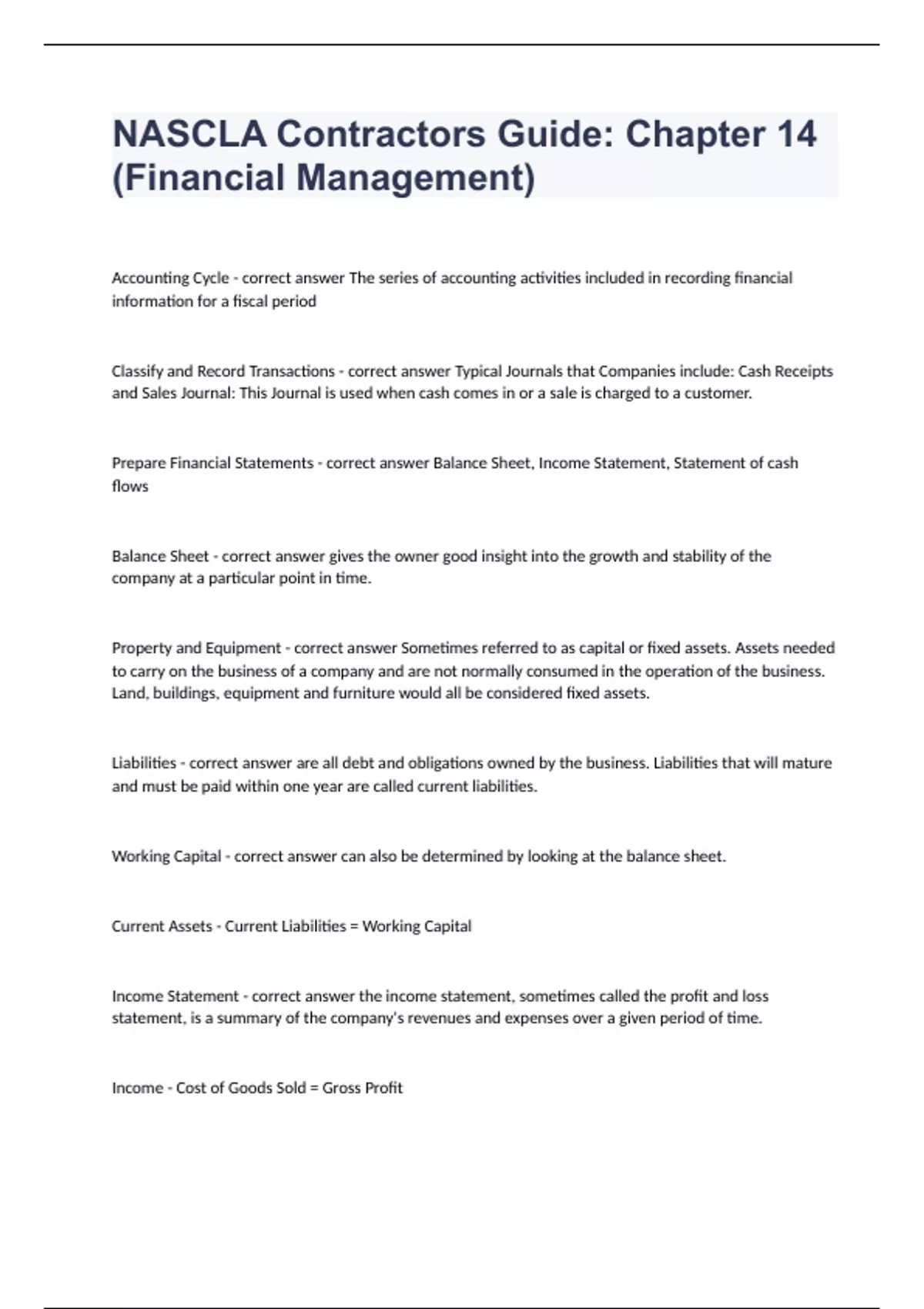 NASCLA Contractors Guide Chapter 14 (Financial Management)Accounting Cycle - correct answer The series of accounting activities included in recording financial information for a fiscal period Classify and Record Transactions - correct answer Typical Journals that Companies include: Cash Receipts and Sales Journal: This Journal is used when cash comes in or a sale is charged to a customer. Prepare Financial Statements - correct answer Balance Sheet, Income Statement, Statement of cash flows Balance Sheet - correct answer gives the owner good insight into the growth and stability of the company at a particular point in time. Property and Equipment - correct answer Sometimes referred to as capital or fixed assets. Assets needed to carry on the business of a company and are not normally consumed in the operation of the business. Land, buildings, equipment and furniture would all be considered fixed assets. Liabilities - correct answer are all debt and obligations owned by the business. Liabilities that will mature and must be paid within one year are called current liabilities. Working Capital - correct answer can also be determined by looking at the balance sheet. Current Assets - Current Liabilities = Working Capital Income Statement - correct answer the income statement, sometimes called the profit and loss statement, is a summary of the company's revenues and expenses over a given period of time. Income - Cost of Goods Sold = Gross Profit Gross Profits - Expenses = Net Income Revenues - correct answer are the income received from the daily operations of business. Expenses - correct answer are the monies paid out or owed for goods or services over a given period of time. Direct Costs - correct answer costs directly linked with a particular project. operating expenses - correct answer general items that contribute to the cost of operating a business. Tax Provision Expenses - correct answer The tax liabilities your company has for federal, state and local taxes. Net Profit - correct answer difference between revenues and expenses. Net profit directly contributes to the net worth of the company. Statement of Cash Flows - correct answer summarizes your current cash position, your cash sources, and use of the funds over a given period of time. Quick Ratio - correct answer calculated by dividing the current liabilities into the current assets minus inventory. Activity Ratios - correct answer measures of how effectively the company uses its assets Methods of Accounting - correct answer An accounting method is a set of rules used to determine when and how income and expenses are reported. There are 2 basic methods of accounting used to keep track of the company's income and expenses. 1. cash method 2. accrual method.