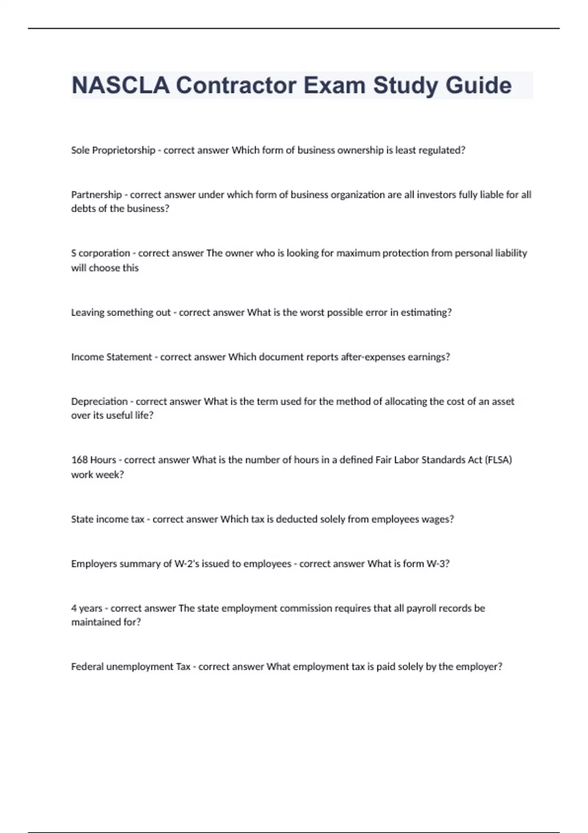 NASCLA Contractor Exam Study GuideSole Proprietorship - correct answer Which form of business ownership is least regulated? Partnership - correct answer under which form of business organization are all investors fully liable for all debts of the business? S corporation - correct answer The owner who is looking for maximum protection from personal liability will choose this Leaving something out - correct answer What is the worst possible error in estimating? Income Statement - correct answer Which document reports after-expenses earnings? Depreciation - correct answer What is the term used for the method of allocating the cost of an asset over its useful life? 168 Hours - correct answer What is the number of hours in a defined Fair Labor Standards Act (FLSA) work week? State income tax - correct answer Which tax is deducted solely from employees wages? Employers summary of W-2's issued to employees - correct answer What is form W-3? 4 years - correct answer The state employment commission requires that all payroll records be maintained for? Federal unemployment Tax - correct answer What employment tax is paid solely by the employer? 4 years - correct answer How long must federal employment tax records be kept? establish a bases for future estimates - correct answer One useful outcome of cost analysis is to? Bonds - correct answer Which of the following is NOT a company overhead cost? Construction loan - correct answer Which of the following is a project overhead cost? Allowances - correct answer What project cost do not need to be estimated? Unit Price - correct answer Which estimating method is most often used when materials and labor are hard to determine? These suppliers must be competitive - correct answer All local contractors should expect their material cost to be similar because... Basis for the bid - correct answer What information do project documents ALWAYS provide? contract - correct answer A legally binding mutual agreement between parties Read and understand the contract - correct answer What action is essential before signing a contract? Written agreements prevail oral agreements - correct answer Which is an established legal guideline for contracts? The standard form of agreement - correct answer Which contract documents MUST be signed by both the owner and the contractor? TURNKEY - correct answer What type of contract assigns the prime contractor responsibility for developing the entire project?