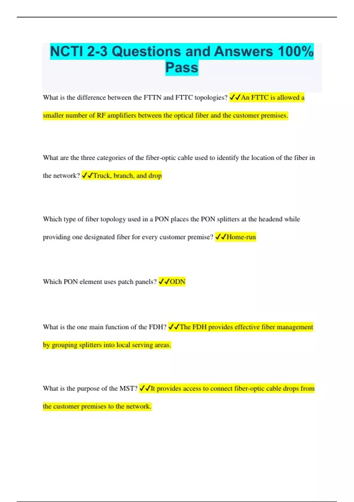 NCTI 2-3 Questions and Answers 100% Pass What is the difference between the FTTN and FTTC topologies? An FTTC is allowed a smaller number of RF amplifiers between the optical fiber and the customer premises. What are the three categories of the fiber-optic cable used to identify the location of the fiber in the network? Truck, branch, and drop Which type of fiber topology used in a PON places the PON splitters at the headend while providing one designated fiber for every customer premise? Home-run Which PON element uses patch panels? ODN What is the one main function of the FDH? The FDH provides effective fiber management by grouping splitters into local serving areas. What is the purpose of the MST? It provides access to connect fiber-optic cable drops from the customer premises to the network. What is the purpose of a fiber demarcation box? It provides a safe place to splice, split, distribute, store, and cross-connect fiber optics. How are optical splitters used in the forward path? As passive branching devices that divide an optical signal across multiple output fibers. What is the main benefit of deploying WDM technology? It will increase the capacity of the existing fiber networks tenfold without adding any more fiber. What is unique about WDM-PON? WDM-PON deployed in a greenfield system allows each subscriber to get their own designated wavelength. What is the purpose of the SDU? It provides surge protection, a test jack, circuit protection, wiring management, and fiber termination. What are the advantages of loose buffer tube fiber? It offers the best protection for the fibers under high pulling tension and moisture with its fiber-coated gel. What is an ONU/ONT? It is a device that converts light from fiber to Rf for coaxial distribution into home. What are the characteristics of ITU-T G.657 BIF? It is flexible for installation in small spaces and has a small bend radius of 7.5 mm or 10mm.