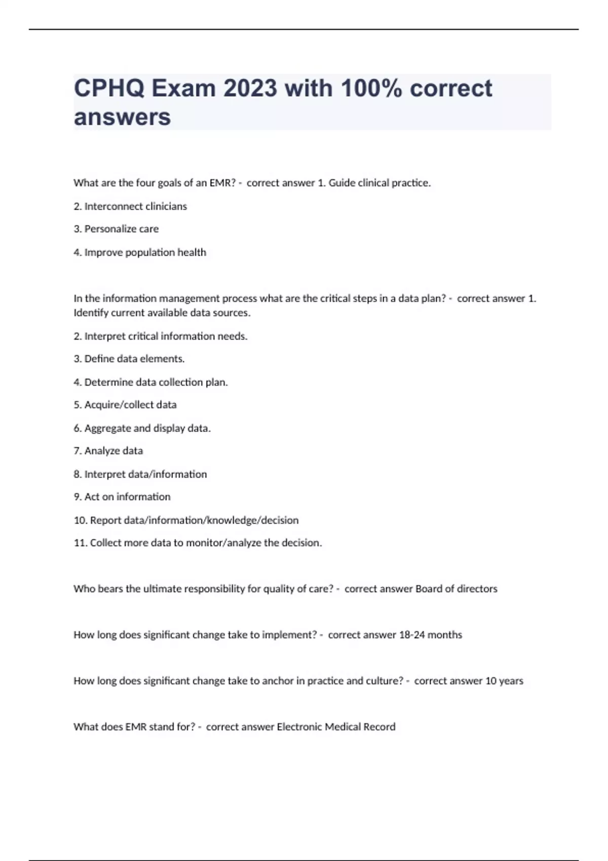 What are the four goals of an EMR? - correct answer 1. Guide clinical practice. 2. Interconnect clinicians 3. Personalize care 4. Improve population health In the information management process what are the critical steps in a data plan? - correct answer 1. Identify current available data sources. 2. Interpret critical information needs. 3. Define data elements. 4. Determine data collection plan. 5. Acquire/collect data 6. Aggregate and display data. 7. Analyze data 8. Interpret data/information 9. Act on information 10. Report data/information/knowledge/decision 11. Collect more data to monitor/analyze the decision. Who bears the ultimate responsibility for quality of care? - correct answer Board of directors How long does significant change take to implement? - correct answer 18-24 months How long does significant change take to anchor in practice and culture? - correct answer 10 years What does EMR stand for? - correct answer Electronic Medical Record What does PPE stand for? - correct answer Personal Protective Equipment What is the role of quality personnel? - correct answer To provide consultative support to the governing body and m