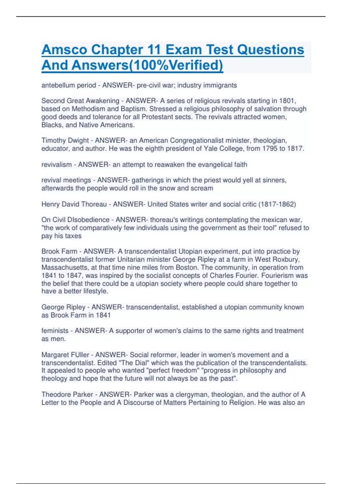 Amsco Chapter 11 Exam Test Questions And Answers(100%Verified) antebellum period - ANSWER- pre-civil war; industry immigrants Second Great Awakening - ANSWER- A series of religious revivals starting in 1801, based on Methodism and Baptism. Stressed a religious philosophy of salvation through good deeds and tolerance for all Protestant sects. The revivals attracted women, Blacks, and Native Americans. Timothy Dwight - ANSWER- an American Congregationalist minister, theologian, educator, and author. He was the eighth president of Yale College, from 1795 to 1817. revivalism - ANSWER- an attempt to reawaken the evangelical faith revival meetings - ANSWER- gatherings in which the priest would yell at sinners, afterwards the people would roll in the snow and scream Henry David Thoreau - ANSWER- United States writer and social critic () On Civil DIsobedience - ANSWER- thoreau's writings contemplating the mexican war, "the work of comparatively few individuals using the government as their tool" refused to pay his taxes Brook Farm - ANSWER- A transcendentalist Utopian experiment, put into practice by transcendentalist former Unitarian minister George Ripley at a farm in West Roxbury, Massachusetts, at that time nine miles from Boston. The community, in operation from 1841 to 1847, was inspired by the socialist concepts of Charles Fourier. Fourierism was the belief that there could be a utopian society where people could share together to have a better lifestyle. George Ripley - ANSWER- transcendentalist, established a utopian community known as Brook Farm in 1841 feminists - ANSWER- A supporter of women's claims to the same rights and treatment as men. Margaret FUller - ANSWER- Social reformer, leader in women's movement and a transcendentalist. Edited "The Dial" which was the publication of the transcendentalists. It appealed to people who wanted "perfect freedom" "progress in philosophy and theology and hope that the future will not always be as the past". Theodore Parker - ANSWER- Parker was a clergyman, theologian, and the author of A Letter to the People and A Discourse of Matters Pertaining to Religion. He was also an active opponent of slavery who aided in the escape of slaves and the rescue of Anthony Burns, supported New England Emigrant Society, and participated in John Brown's raid in 1859. utopian communities - ANSWER- groups of people who tried to form a perfect society Shakers - ANSWER- a celibate and communistic Christian sect in the United States Robert Owen - ANSWER- () British cotton manufacturer believed that humans would reveal their true natural goodness if they lived in a cooperative environment. Tested his theories at New Lanark, Scotland and New Harmony, Indiana, but failed New Harmony - ANSWER- This was a society that focusted on Utopian Socialism (Communism). It was started by Robert Owens but failed because everybody did not share a fair load of the work.q Joseph Henry Noyes - ANSWER- Helped found the Oneida Communit
