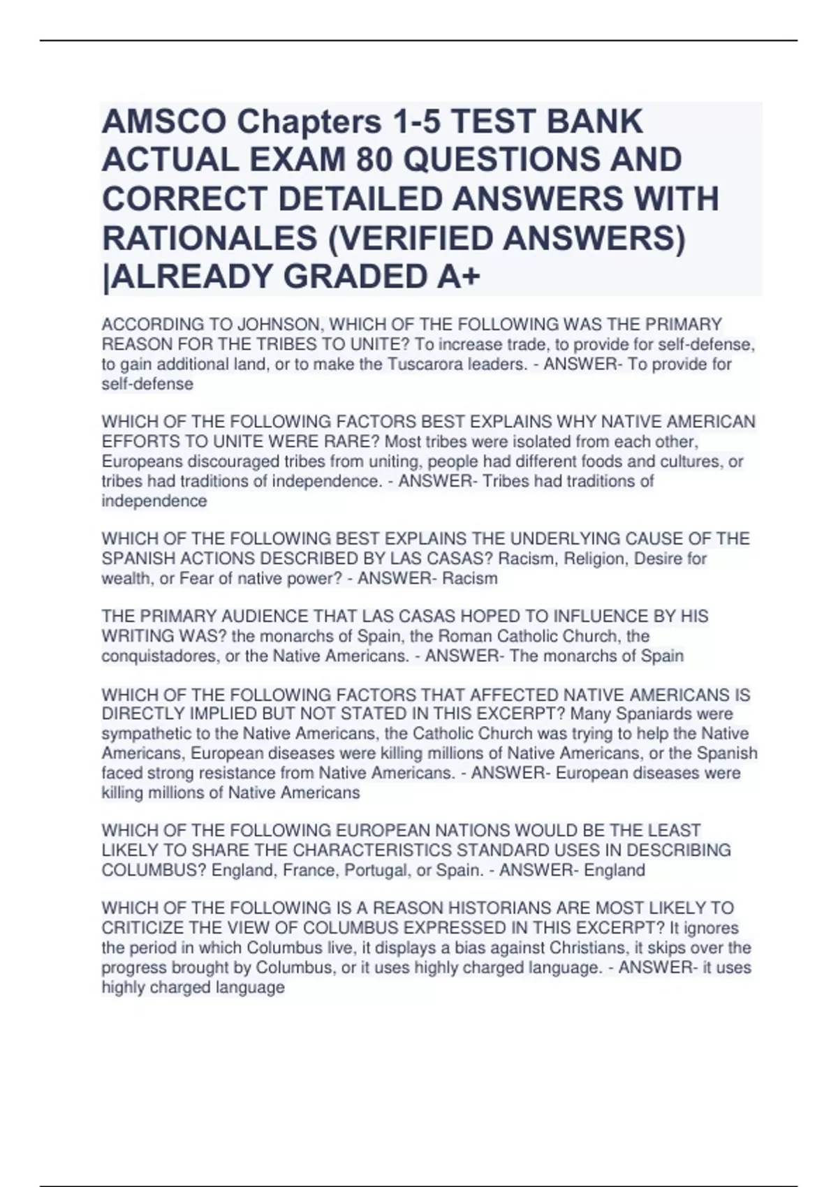 AMSCO Chapters 1-5 TEST BANK ACTUAL EXAM 80 QUESTIONS AND CORRECT DETAILED ANSWERS WITH RATIONALES (VERIFIED ANSWERS) |ALREADY GRADED A+ ACCORDING TO JOHNSON, WHICH OF THE FOLLOWING WAS THE PRIMARY REASON FOR THE TRIBES TO UNITE? To increase trade, to provide for self-defense, to gain additional land, or to make the Tuscarora leaders. - ANSWER- To provide for self-defense WHICH OF THE FOLLOWING FACTORS BEST EXPLAINS WHY NATIVE AMERICAN EFFORTS TO UNITE WERE RARE? Most tribes were isolated from each other, Europeans discouraged tribes from uniting, people had different foods and cultures, or tribes had traditions of independence. - ANSWER- Tribes had traditions of independence WHICH OF THE FOLLOWING BEST EXPLAINS THE UNDERLYING CAUSE OF THE SPANISH ACTIONS DESCRIBED BY LAS CASAS? Racism, Religion, Desire for wealth, or Fear of native power? - ANSWER- Racism THE PRIMARY AUDIENCE THAT LAS CASAS HOPED TO INFLUENCE BY HIS WRITING WAS? the monarchs of Spain, the Roman Catholic Church, the conquistadores, or the Native Americans. - ANSWER- The monarchs of Spain WHICH OF THE FOLLOWING FACTORS THAT AFFECTED NATIVE AMERICANS IS DIRECTLY IMPLIED BUT NOT STATED IN THIS EXCERPT? Many Spaniards were sympathetic to the Native Americans, the Catholic Church was trying to help the Native Americans, European diseases were killing millions of Native Americans, or the Spanish faced strong resistance from Native Americans. - ANSWER- European diseases were killing millions of Native Americans WHICH OF THE FOLLOWING EUROPEAN NATIONS WOULD BE THE LEAST LIKELY TO SHARE THE CHARACTERISTICS STANDARD USES IN DESCRIBING COLUMBUS? England, France, Portugal, or Spain. - ANSWER- England WHICH OF THE FOLLOWING IS A REASON HISTORIANS ARE MOST LIKELY TO CRITICIZE THE VIEW OF COLUMBUS EXPRESSED IN THIS EXCERPT? It ignores the period in which Columbus live, it displays a bias against Christians, it skips over the progress brought by Columbus, or it uses highly charged language. - ANSWER- it uses highly charged language BASED ON CORONADO'S OBSERVATIONS, WHICH OF THE FOLLOWING BEST DESCRIBES SPANISH EFFORTS IN MEXICO IN THE MID-16TH CENTURY? Exploring lands new to them, establishing colonies, warring with Native Americans, or spreading the Christian faith. - ANSWER- Exploring lands new to them THE ACTIVITIES OF CORONO AND OTHER SPANISH AND PORTUGUESE EXPLORERS IN THE AMERICAS IN THE 16TH CENTURY PRIMARILY DEPENDED ON THE SUPPORT OF : Merchants and fur traders, the Catholic Church, the monarchs, or enslaved Europeans. - ANSWER- the monarchs WHICH OF THE FOLLOWING RELIGIOUS GROUPS WERE THE AUTHORS OF THE MARYLAND ACT OF TOLERATION TRYING TO PROTECT? Jews, Puritans, Quakers, or Roman Catholics. - ANSWER- Roman Catholics WHICH OF THE FOLLOWING BEST SUMMARIZES THE ATTITUDE TOWARD RELIGIOUS BELIEFS EXPRESSED IN THIS DOCUMENT? All individuals should be free to believe or not believe in God as they wished, Religion was a personal matter that the government shouldn't try to influence, Christians should be able to practice their faith without fear of persecution, or the colony should be reserved for the one specific type of Christianity approved by the local government officials. - ANSWER- Christians should be able to practice their faith without fear of persecution BASED ON THE INFORMATION IN THIS EXCERPT, WHAT IS SAMUEL KERCHEVAL'S POINT OF VIEW TOWARD BACON AND HIS FOLLOWERS? They were dangerous men who threatened colonial stability and prosperity, they were frustrated men who were taking action because the government did not, they were allies of the governor who carried out actions that he supported, or they were a primarily political movement that wanted Bacon to become governor. - ANSWER- they were frustrated men who were taking action because the government did not BACON'S REBELLION WAS INITIATED BY A GROUP OF FARMERS WHO FELT MOST DIRECTLY THREATENED BY : an increase in royal taxes, the power of large planters, conflicts with American Indians, or the growth of the slave trade. - ANSWERconflicts with American Indians WHICH OF THE FOLLOWING LED THE OPPOSITION TO BACON'S REBELLION? leaders of the Church of England, members of the Virginia House of Burgesses, soldiers from the British army, or the colonial governor. - ANSWER- the colonial governor WHAT DID PORY PREDICT FOR THE FUTURE OF VIRGINIA? it would approach "perfection" because of agricultural products, it would prosper by selling "arms/apparel/bedding", it would decline if its "riches" continued to "consiste in Tobacco", or it would collapse unless it found laborers who were "very handy". - ANSWER- it would approach "perfection" because of agricultural products WHICH OF THE FOLLOWING GROUPS MADE UP MOST OF THE SERVANTS REFERRED TO IN THE PASSAGE? American Indians, Indentured servants from Europe, Enslaved Africans, or women whose husbands had escaped. - ANSWERIndentured servants from Europe THE PRIMARY MARKET FOR THE VIRGINIA TOBACCO CROP DURING THIS PERIOD WAS : Virginia, England, New England, or Africa. - ANSWER- England WHICH OF THE FOLLOWING DID LOCKE SEE AS THE ORIGINAL LIMIT ON HUMAN FREEDOM? Royal law, Constitutional law, church law, or law of nature. - ANSWER- law of nature LOCKE BELIEVED THAT POLITICAL SOCIETY WAS BASED ON : agreement of a majority, traditional community values, royal authority, or unanimous consent. - ANSWER- agreement of a majority WHICH OF THE FOLLOWING GROUPS IN THE COLONIES IN THE LATE 17TH CENTURY WOULD BE MOST CRITICAL OF LOCKE'S IDEAS? slave owners, church leaders, merchants, or women. - ANSWER- Slave owners WHICH OF THE FOLLOWING WAS THE PRIMARY REASON FOR CHARGING PETER ZENGER WITH LIBEL? Zenger printed false statements, the prosecutor dislike Zenger because he was Dutch, the prosecutor wanted to defend the royal government, or Zenger criticized the king. - ANSWER- the prosecutor wanted to defend the royal governmen