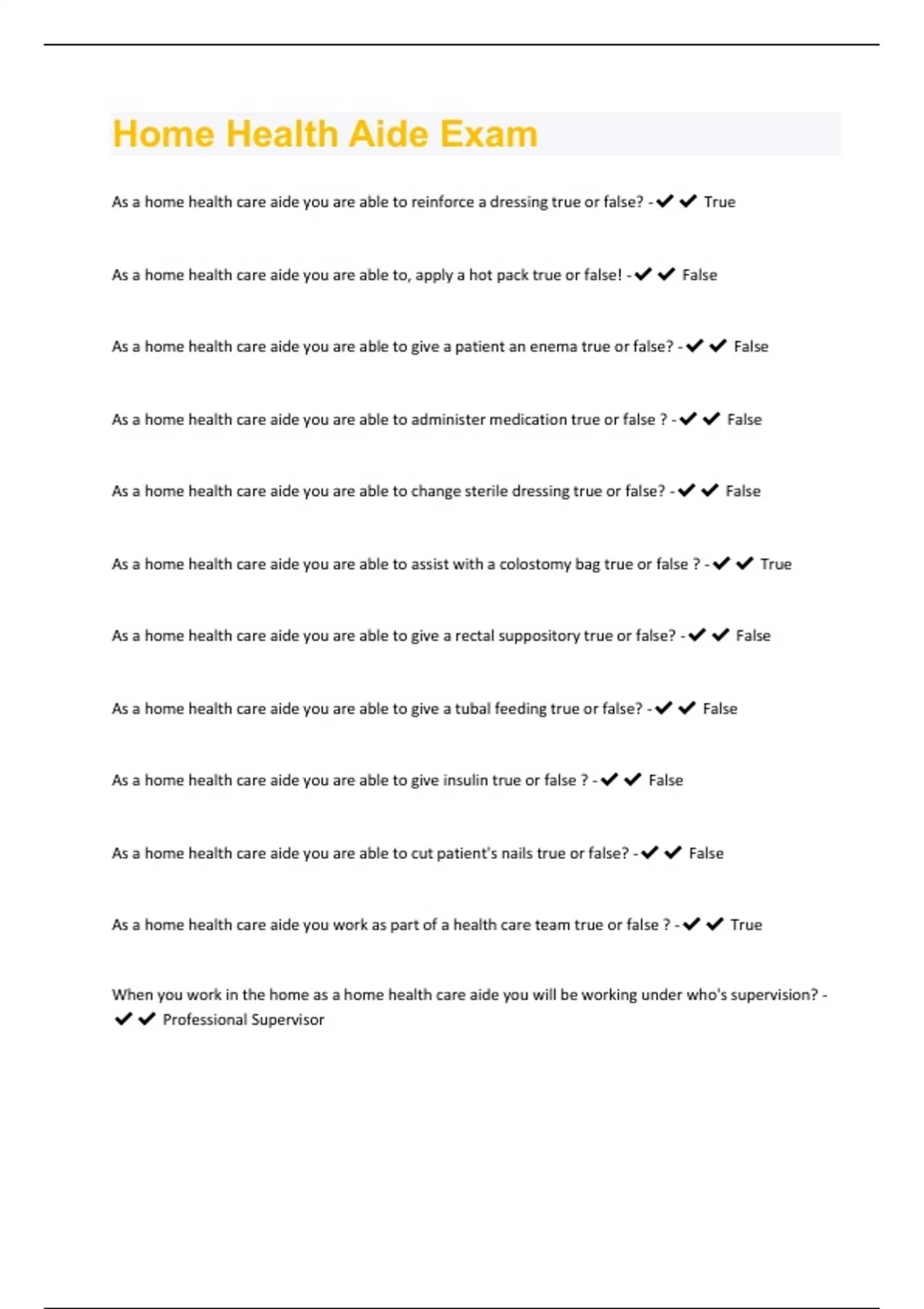 As a home health care aide you are able to reinforce a dressing true or false? - True As a home health care aide you are able to, apply a hot pack true or false! - False As a home health care aide you are able to give a patient an enema true or false? - False As a home health care aide you are able to administer medication true or false ? - False As a home health care aide you are able to change sterile dressing true or false? - False As a home health care aide you are able to assist with a colostomy bag true or false ? - True As a home health care aide you are able to give a rectal suppository true or false? - False As a home health care aide you are able to give a tubal feeding true or false? - False As a home health care aide you are able to give insulin true or false ? - False As a home health care aide you are able to cut patient's nails true or false? - False As a home health care aide you work as part of a health care team true or false ? - True When you work in the home as a home health care aide you will be working under who's supervision? - Professional SupervisorAs a home health care aide your responsibility is ? - To only complete tasks that the RN or therapist assigns you to do.