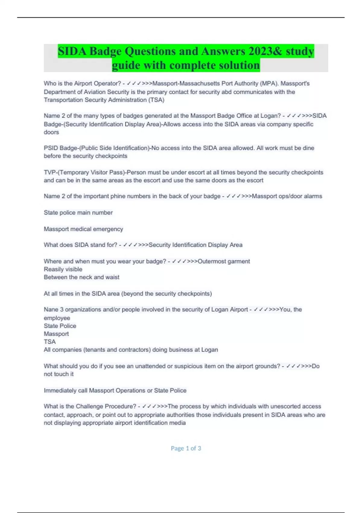 SIDA Badge Questions and Answers 2023& study guide with complete solution