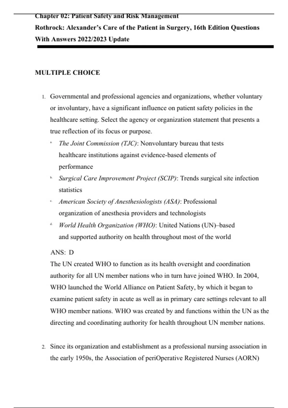Chapter 02: Patient Safety and Risk Management Rothrock: Alexander’s Care of the Patient in Surgery, 16th Edition Questions With Answers 2022/2023 Update