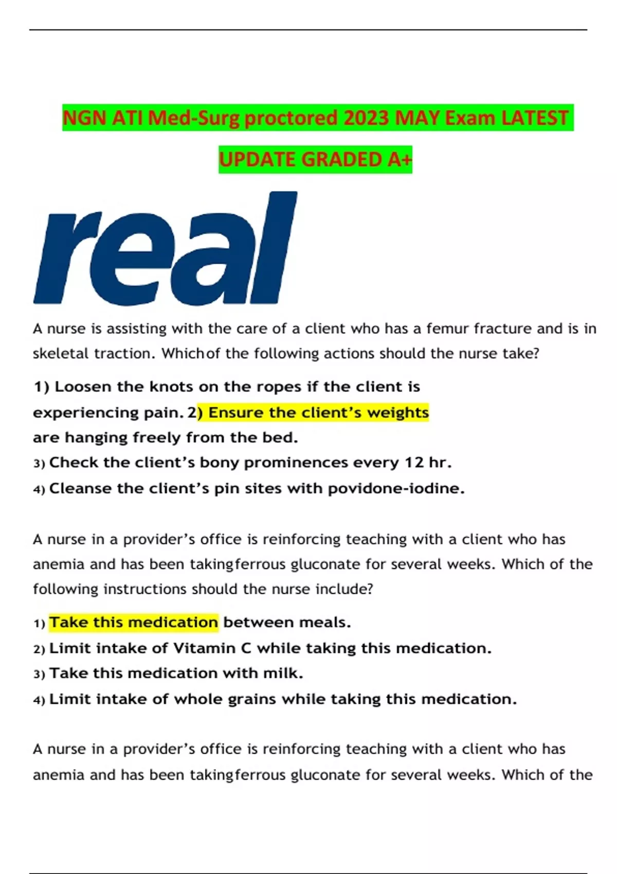 NGN ATI Med-Surg proctored 2023 MAY Exam LATEST UPDATE GRADED A+ A nurse is assisting with the care of a client who has a femur fracture and is in skeletal traction. Whichof the following actions should the nurse take? 1) Loosen the knots on the ropes if the client is experiencing pain.2) Ensure the client’s weights are hanging freely from the bed. 3) Check the client’s bony prominences every 12 hr. 4) Cleanse the client’s pin sites with povidone-iodine. A nurse in a provider’s office is reinforcing teaching with a client who has anemia and has been takingferrous gluconate for several weeks. Which of the following instructions should the nurse include? 1) Take this medication between meals. 2) Limit intake of Vitamin C while taking this medication. 3) Take this medication with milk. 4) Limit intake of whole grains while taking this medication.