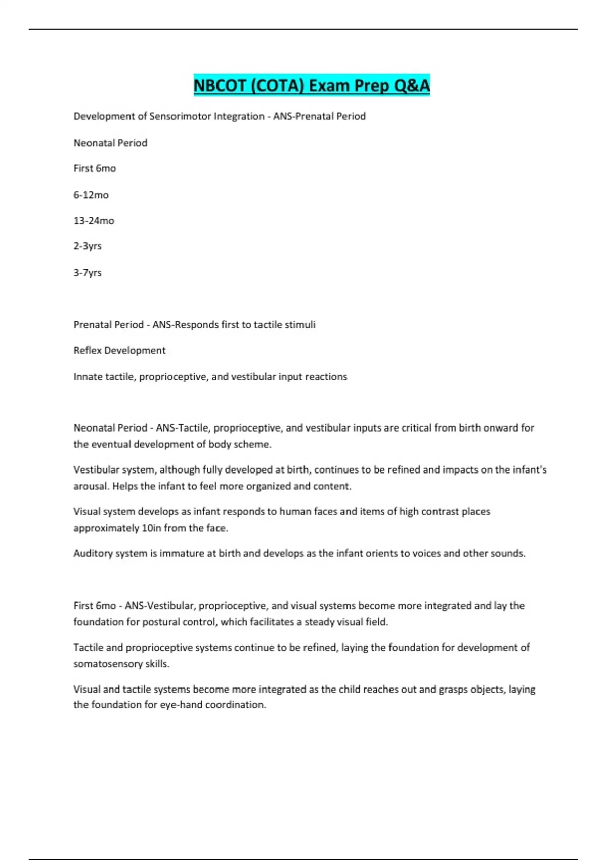 NBCOT (COTA) Exam Prep Q&A Development of Sensorimotor Integration - ANS-Prenatal Period Neonatal Period First 6mo 6-12mo 13-24mo 2-3yrs 3-7yrs Prenatal Period - ANS-Responds first to tactile stimuli Reflex Development Innate tactile, proprioceptive, and vestibular input reactions Neonatal Period - ANS-Tactile, proprioceptive, and vestibular inputs are critical from birth onward for the eventual development of body scheme. Vestibular system, although fully developed at birth, continues to be refined and impacts on the infant's arousal. Helps the infant to feel more organized and content. Visual system develops as infant responds to human faces and items of high contrast places approximately 10in from the face. Auditory system is immature at birth and develops as the infant orients to voices and other sounds. First 6mo - ANS-Vestibular, proprioceptive, and visual systems become more integrated and lay the foundation for postural control, which facilitates a steady visual field. Tactile and proprioceptive systems continue to be refined, laying the foundation for development of somatosensory skills. Visual and tactile systems become more integrated as the child reaches out and grasps objects, laying the foundation for eye-hand coordination. Infant movement patterns progress from reflexive to voluntary and goal directed. 6-12mo - ANS-Vestibular, visual, and somatosensory responses increase in quantity and quality as the infant becomes more mobile. Tactile and proprioceptive perception becomes more refined, allowing for development of fine motor and motor planning skills. Tactile and proprioceptive responses also lead to midline skills and eventual crossing of midline. Auditory, tactle, and proprioceptive perception is heightened allowing for development of sounds for the purpose of communication. Tactile, proprioceptive, gustatory, and olfactory perception are integrated, allowing for primitive selffeeding. 13-24mo - ANS-Tactile perception becomes more precise allowing for discrimination and localization to further refinement of fine motor skills. Further integration of all systems promotes the complexity of motor planning as the toddler's repertoire of movement patterns expands. Symbolic gesturing and vocalization promotes ideation, indicating the toddler's ability to conceptualize. Motor planning abilities contribute to self-concept as the toddler begins to master the environment. 2-3yrs - ANS-This is a period of refinement as the vestibular, proprioceptive, and visual systems further develop, leading to improved balance and postural control. Further development of tactile discrimination and localization lead to improved fine motor skills. Motor planning and praxis ideation also progresses during this period for more skillful occupational performance. 3-7yrs - ANS-Child is driven to challenge sensorimotor competencies through roughhouse play, playground activities, games, sports, music, dancing , arts and crafts, household chores, and school tasks. These occupations provide opportunities to promote psychosocial development and self-esteem. CONTINUES...