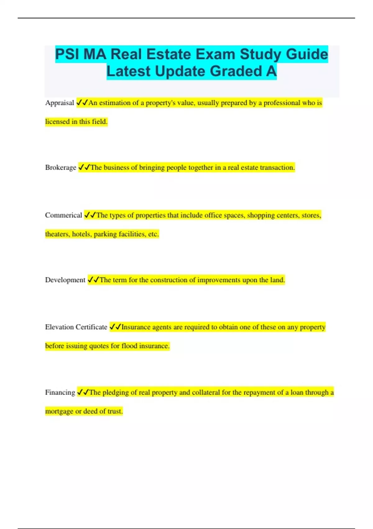 PSI MA Real Estate Exam Study Guide Latest Update Graded A