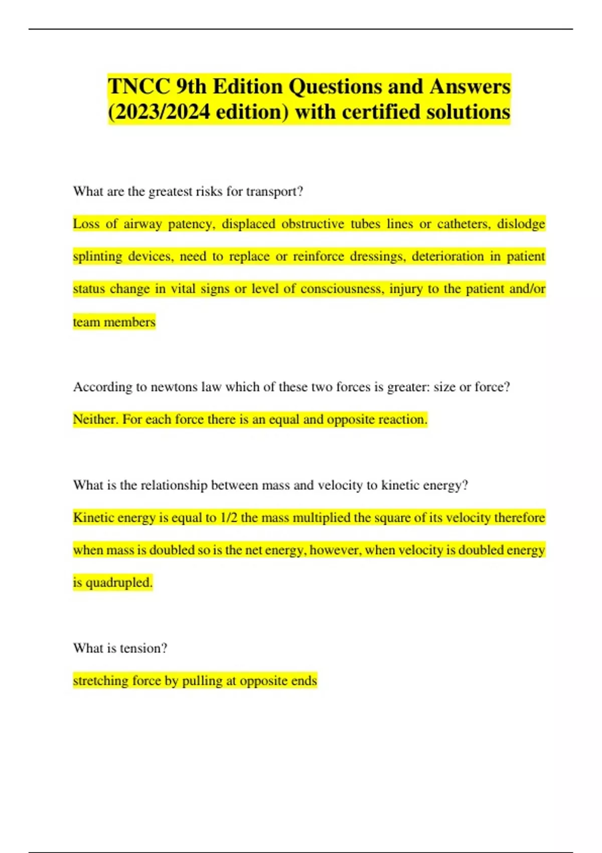 TNCC 9th Edition Questions and Answers (2023/2024 edition) with certified solutions What are the greatest risks for transport? Loss of airway patency, displaced obstructive tubes lines or catheters, dislodge splinting devices, need to replace or reinforce dressings, deterioration in patient status change in vital signs or level of consciousness, injury to the patient and/or team members According to newtons law which of these two forces is greater: size or force? Neither. For each force there is an equal and opposite reaction. What is the relationship between mass and velocity to kinetic energy? Kinetic energy is equal to 1/2 the mass multiplied the square of its velocity therefore when mass is doubled so is the net energy, however, when velocity is doubled energy is quadrupled. What is tension? stretching force by pulling at opposite ends What is compression? Crushing by squeezing together