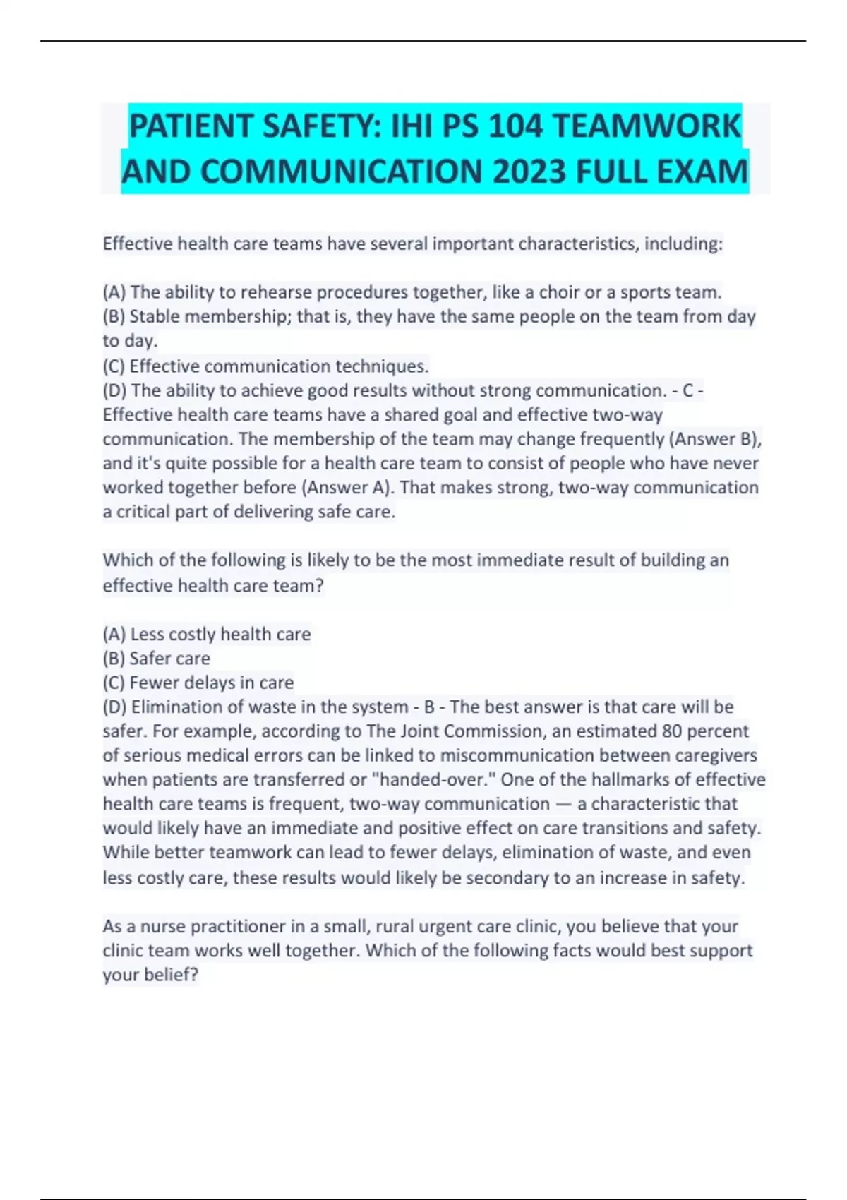 PATIENT SAFETY IHI PS 104 TEAMWORK AND COMMUNICATION 2023 FULL EXAM